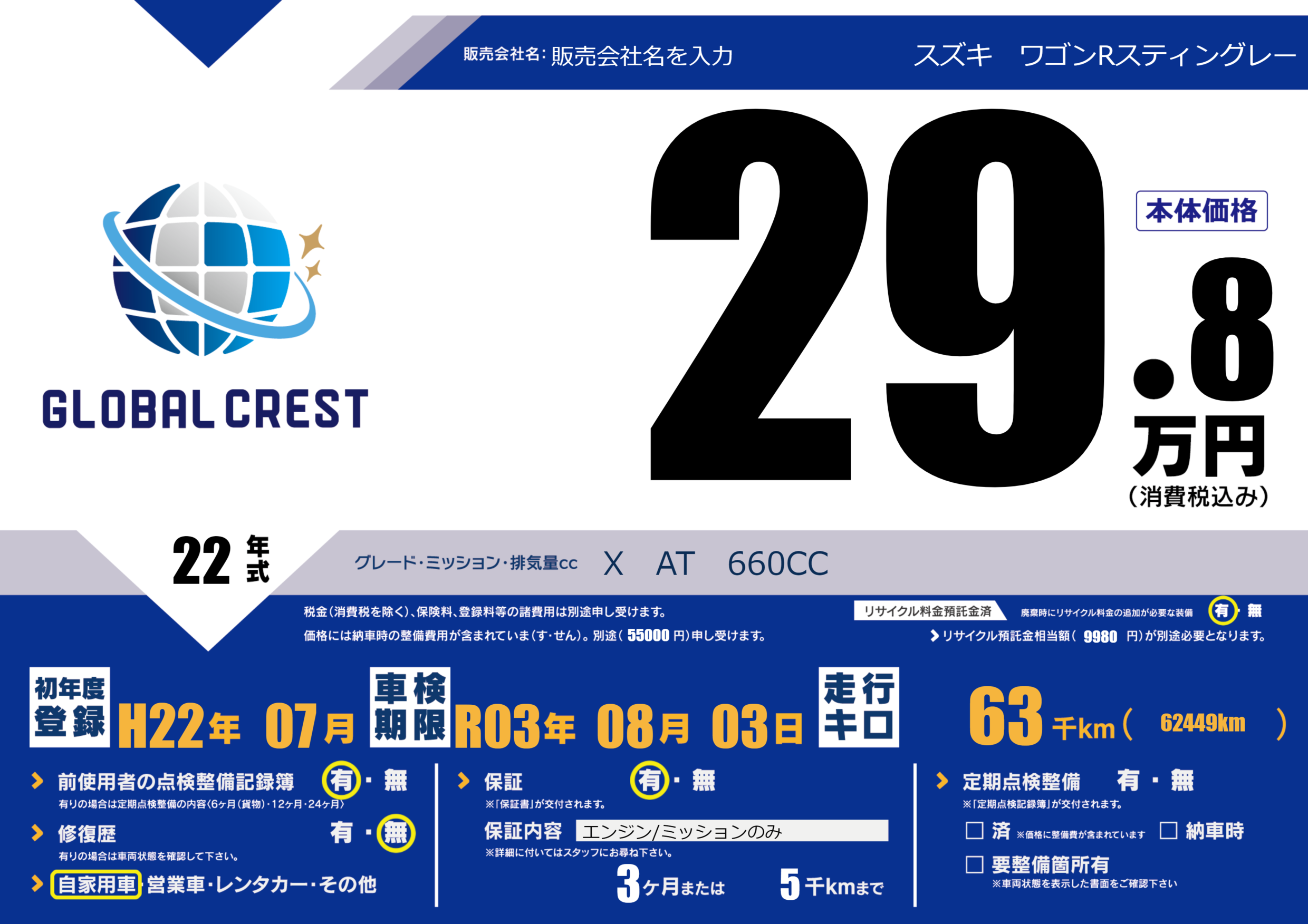 | 走行キロ | 6.3万km | 初年度登録 | H22年07月 |
