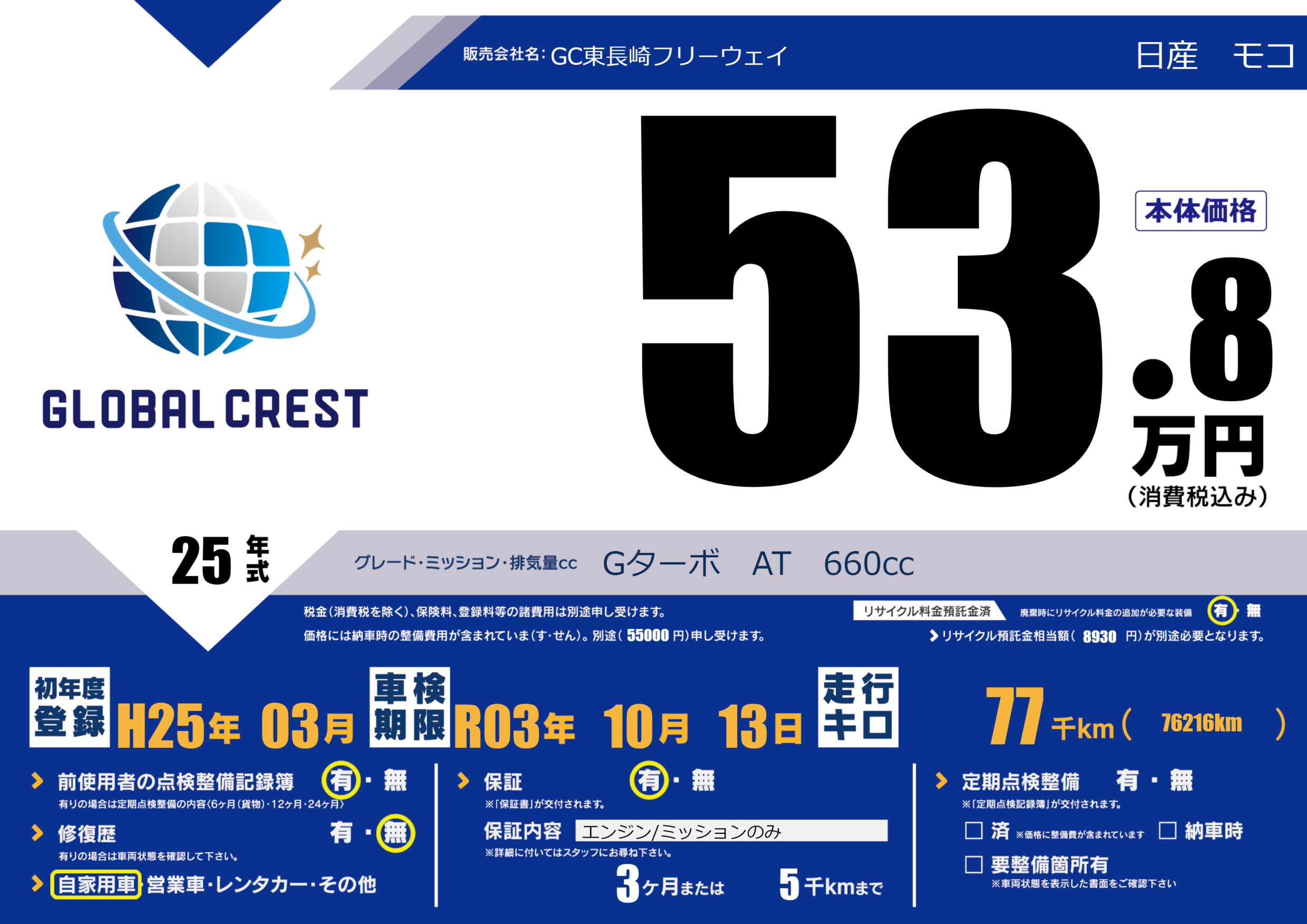 | 車名 | 日産 モコ | グレード ミッション 排気量 |