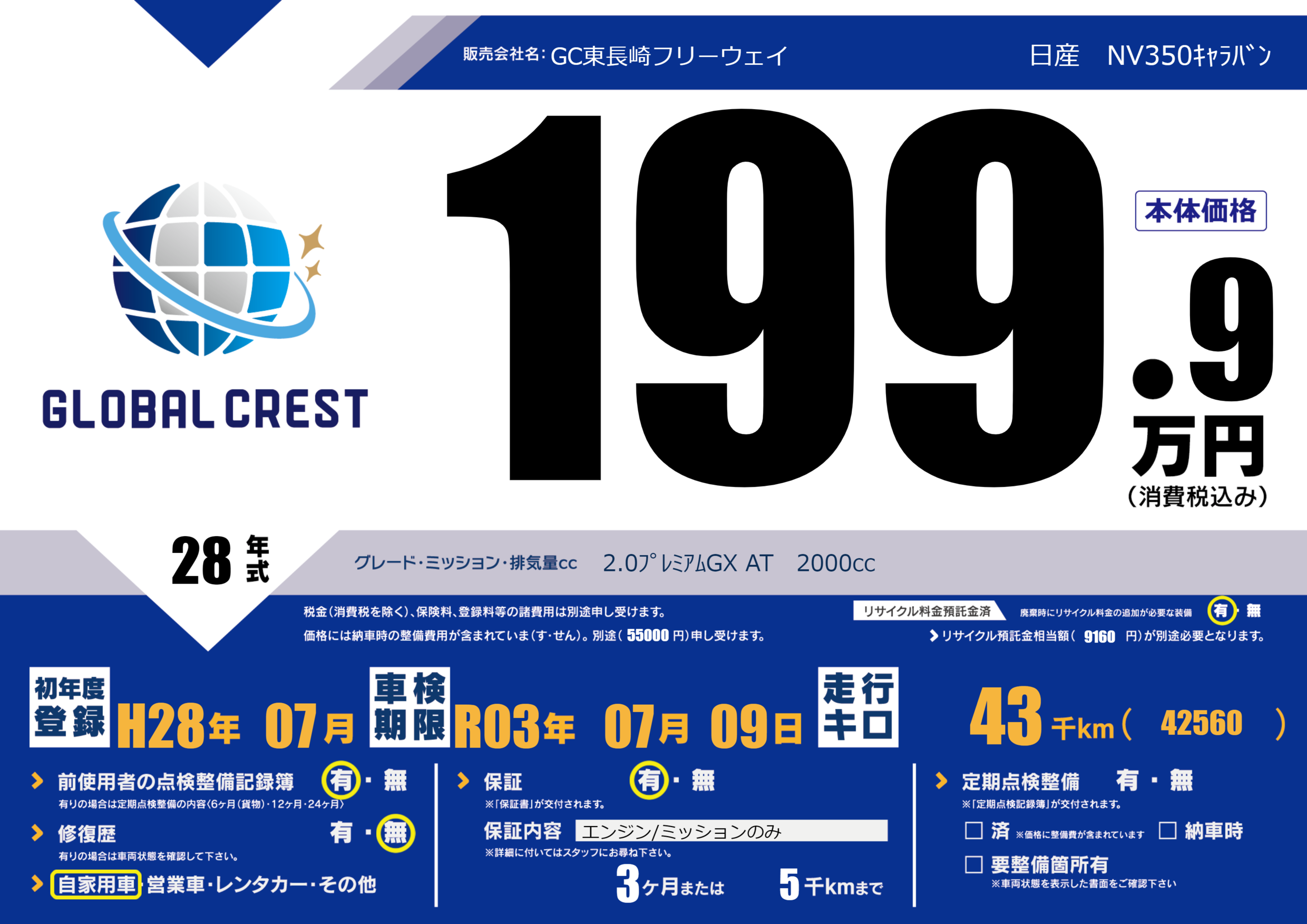 | 車名 | 日産 NV350キャラバン | グレード ミッション 排気量 |