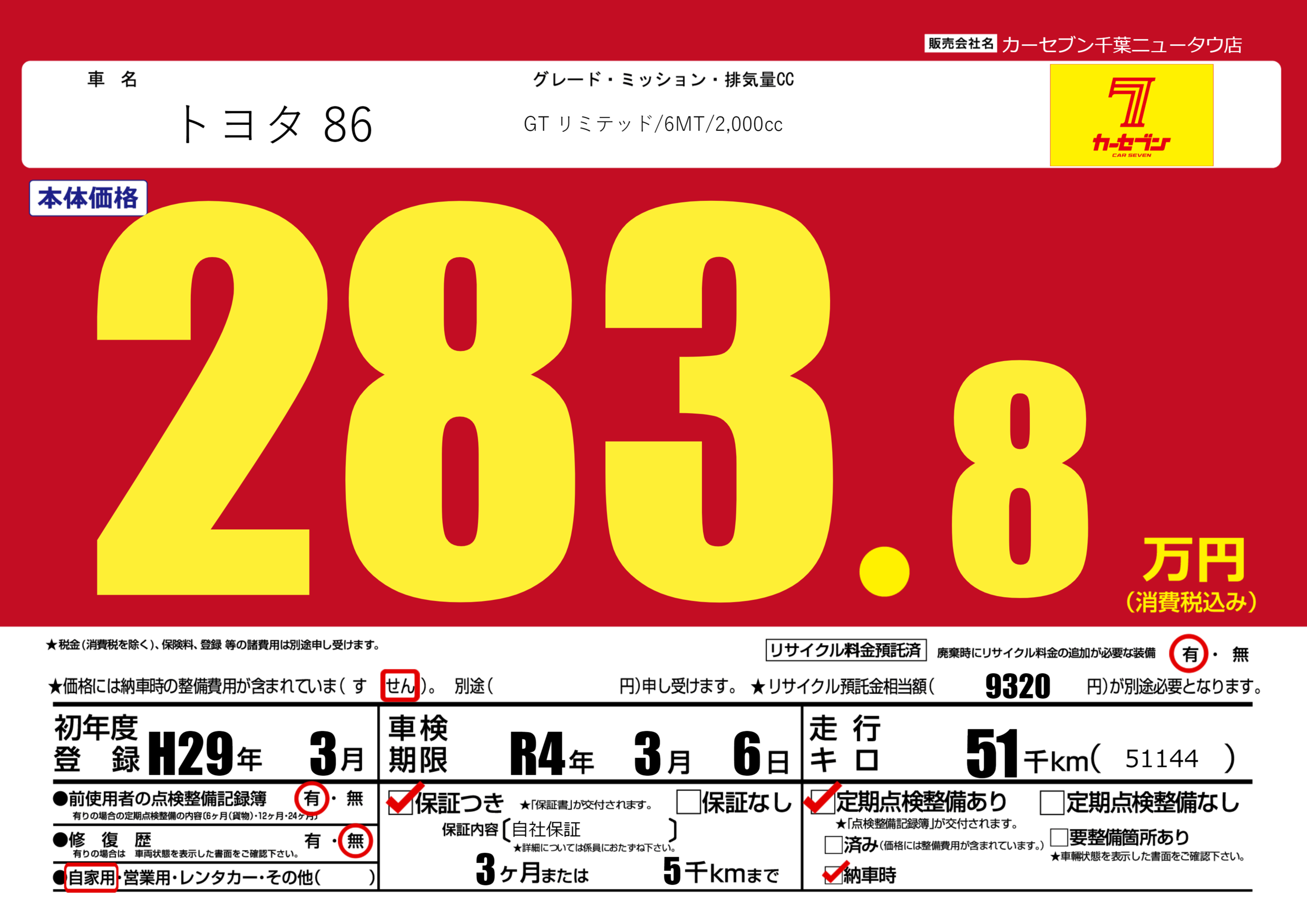 保証付き 保証内容(自社保証) 3ヶ月または(5)千kmまで |