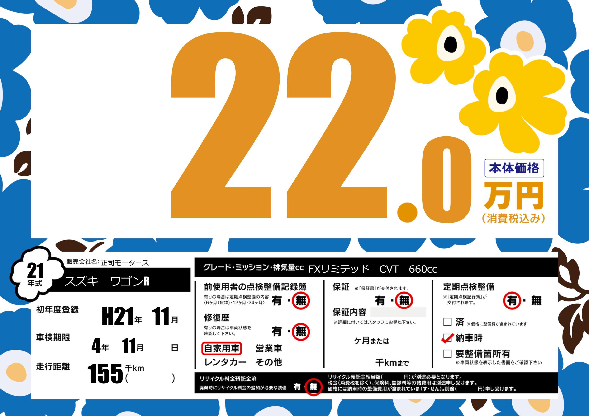 | 走行キロ | 15.5万km | 初年度登録 | H21年11月 |