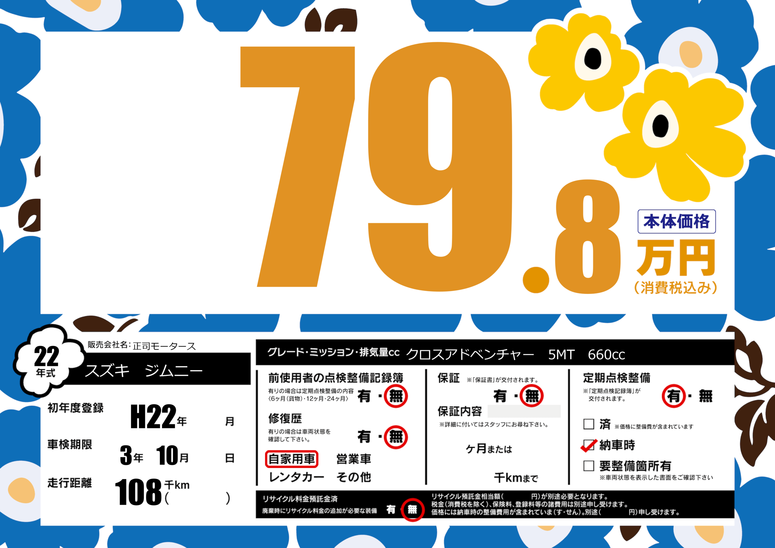 | 車名 | スズキ ジムニー | グレード ミッション 排気量 |