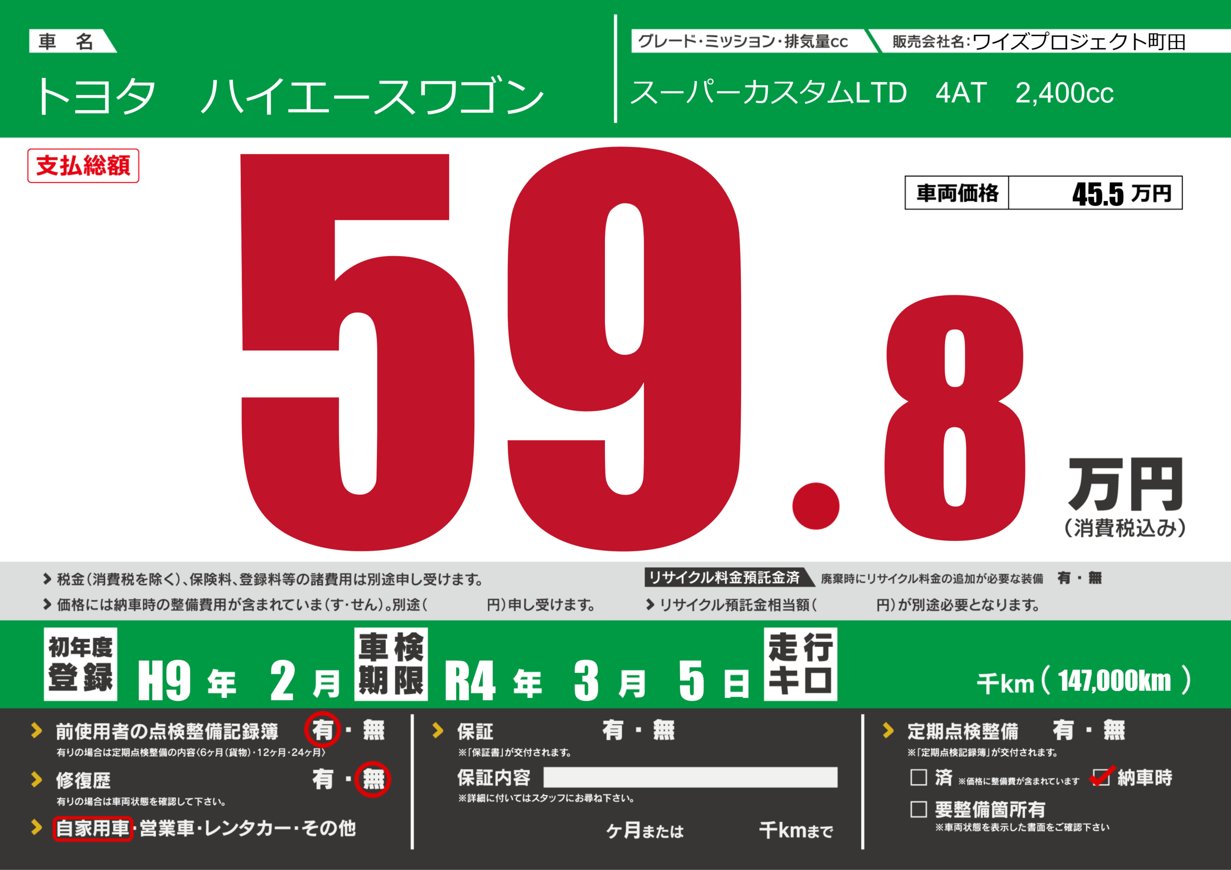 | 車名 | トヨタ ハイエースワゴン | グレード ミッション 排気量 |