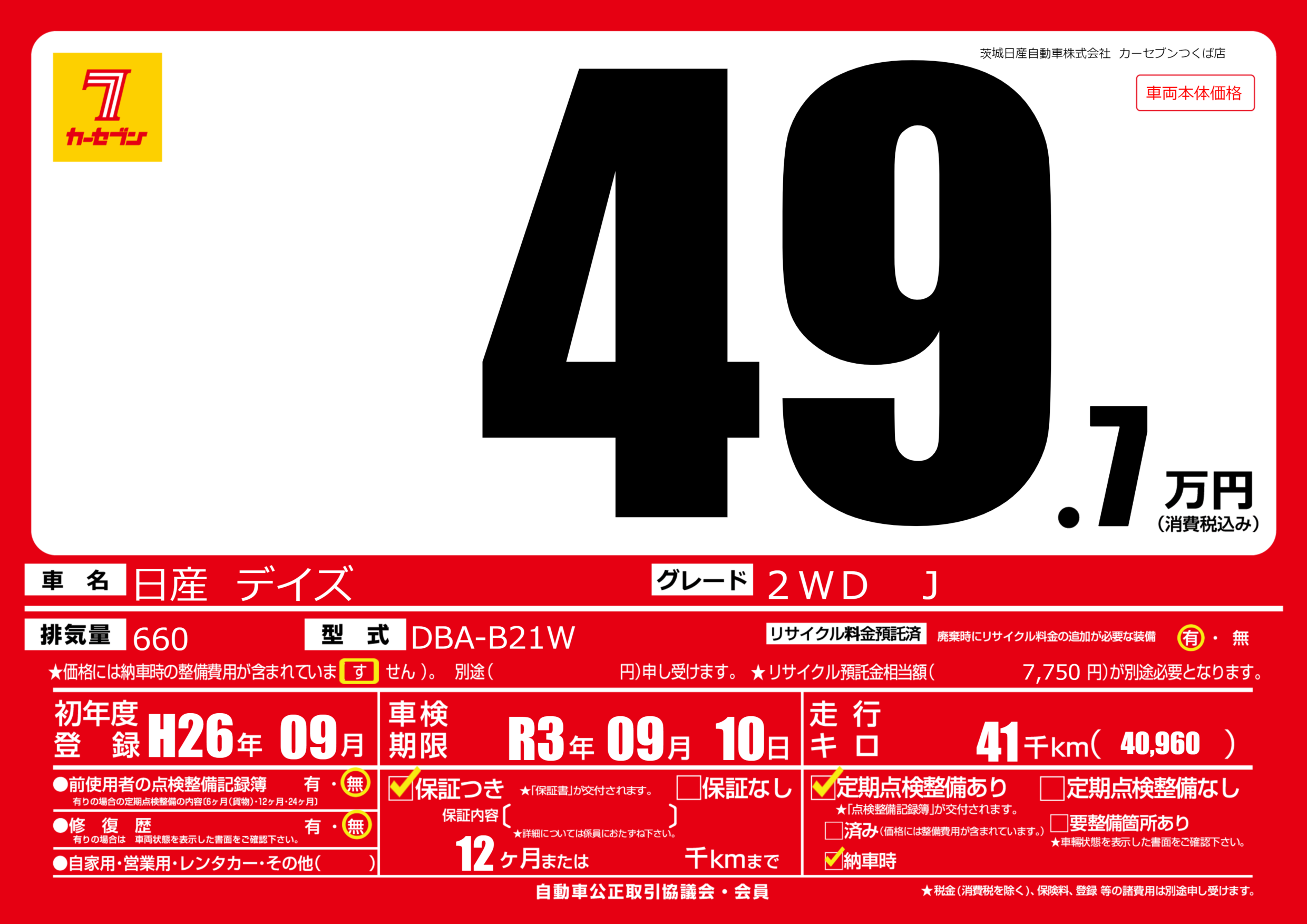 | 車名 | 日産 デイズ | グレード ミッション 排気量 |