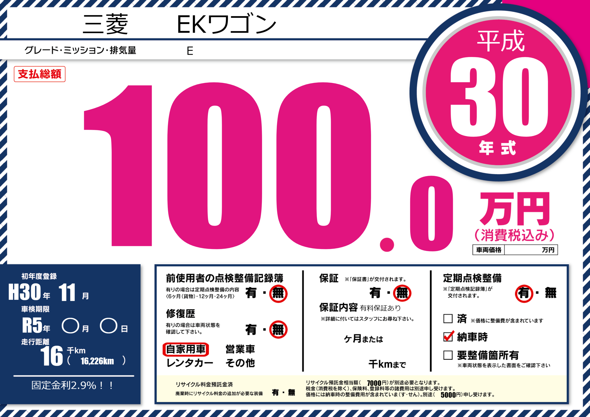 | 車名 | 三菱 EKワゴン | グレード ミッション 排気量 |