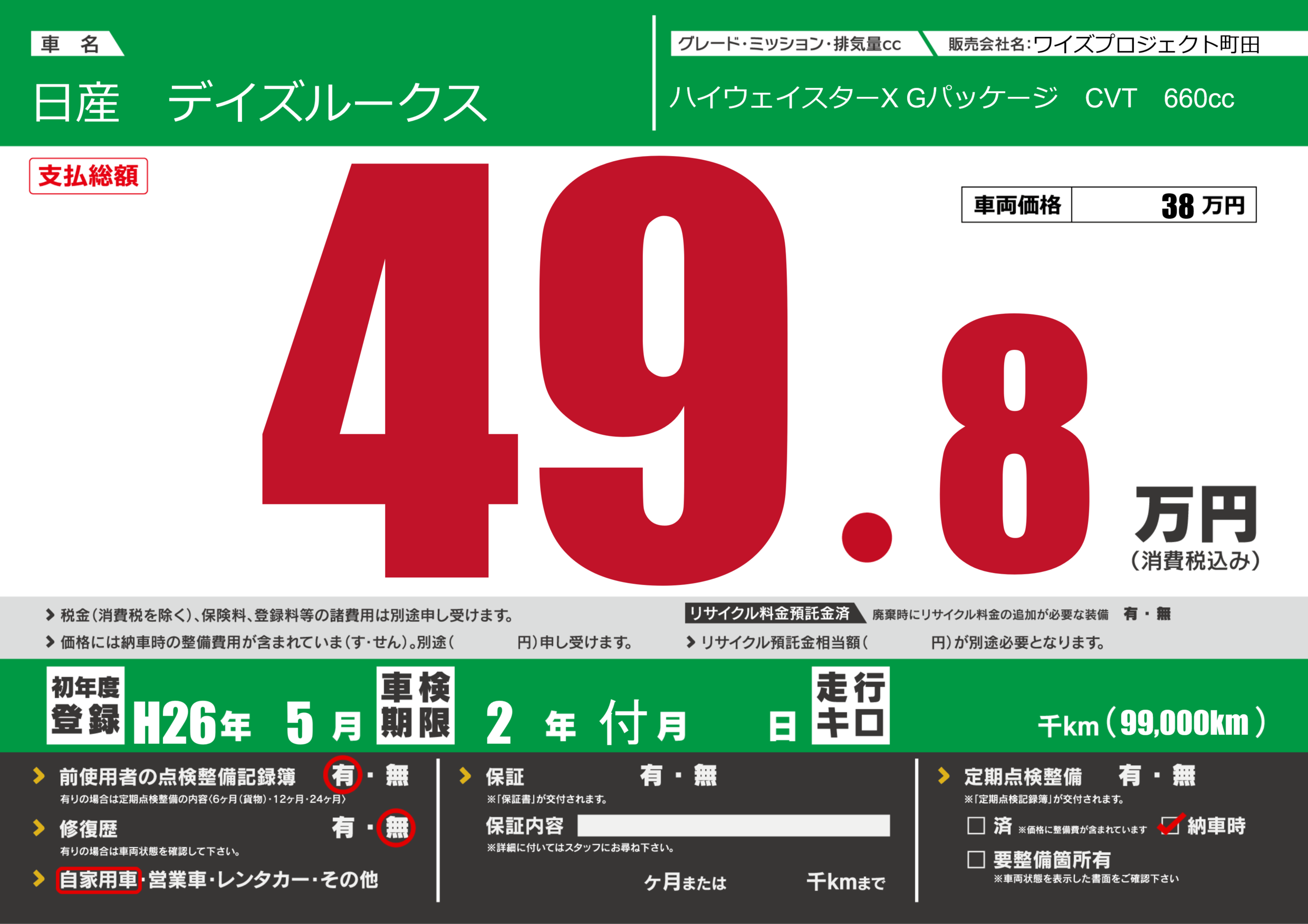 | 車名 | 日産 デイズルークス | グレード ミッション 排気量 |