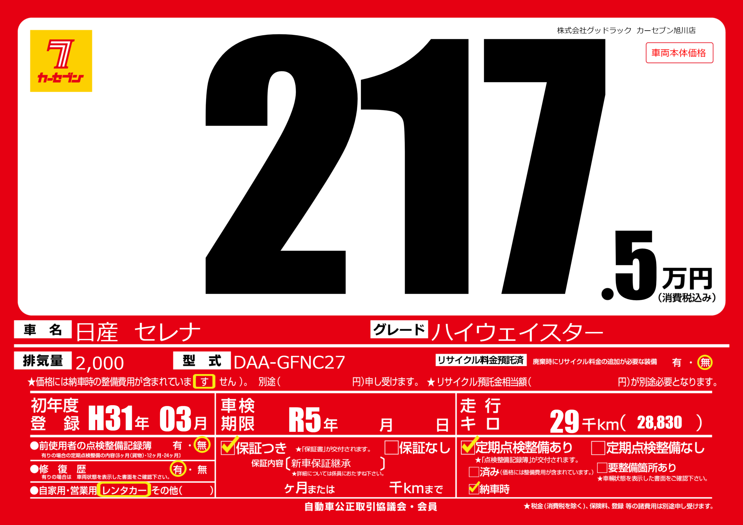 | 走行キロ | 2.9万km | 初年度登録 | H31年03月 |
