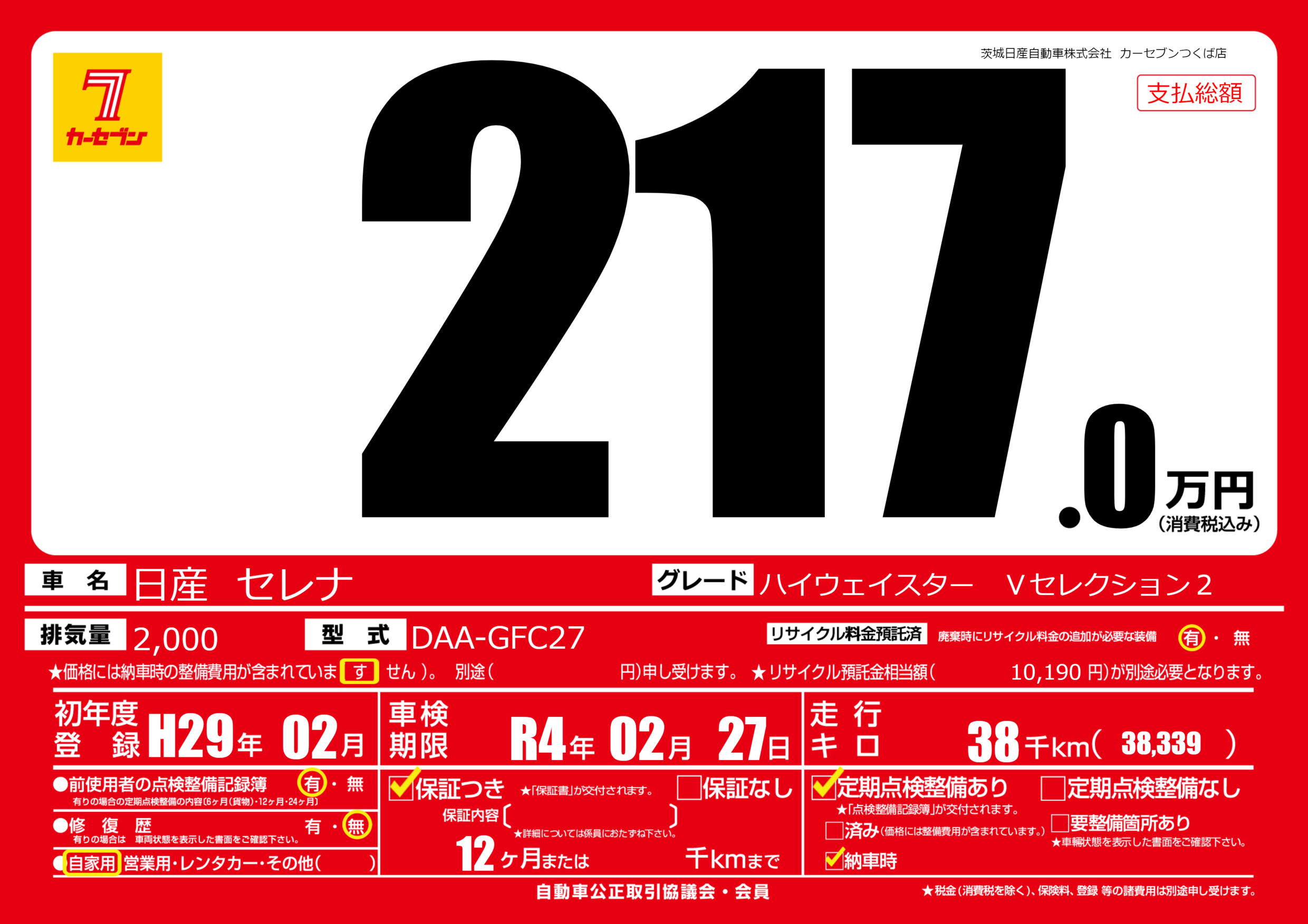 | 車名 | 日産 セレナ | グレード ミッション 排気量 |