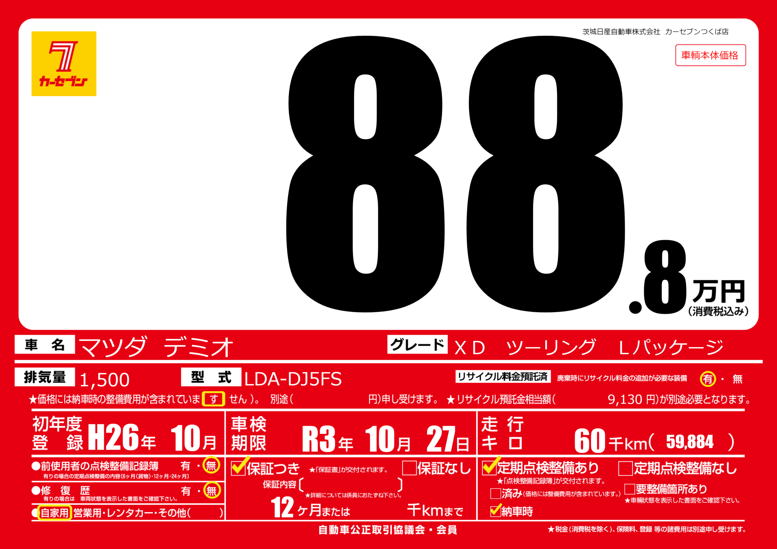 | 車名 | マツダ デミオ | グレード ミッション 排気量 |