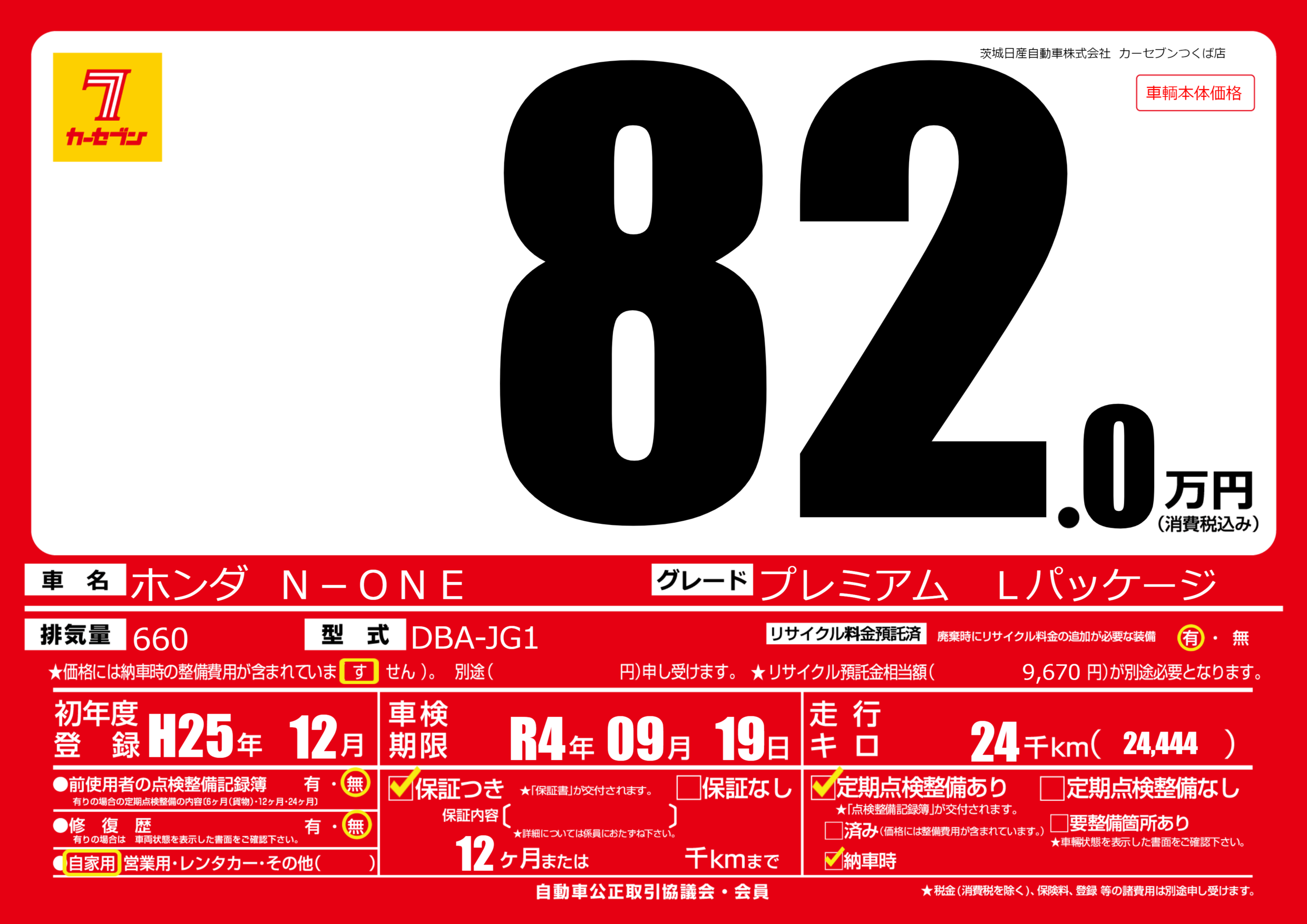 | 車名 | ホンダ N-ONE | グレード ミッション 排気量 |