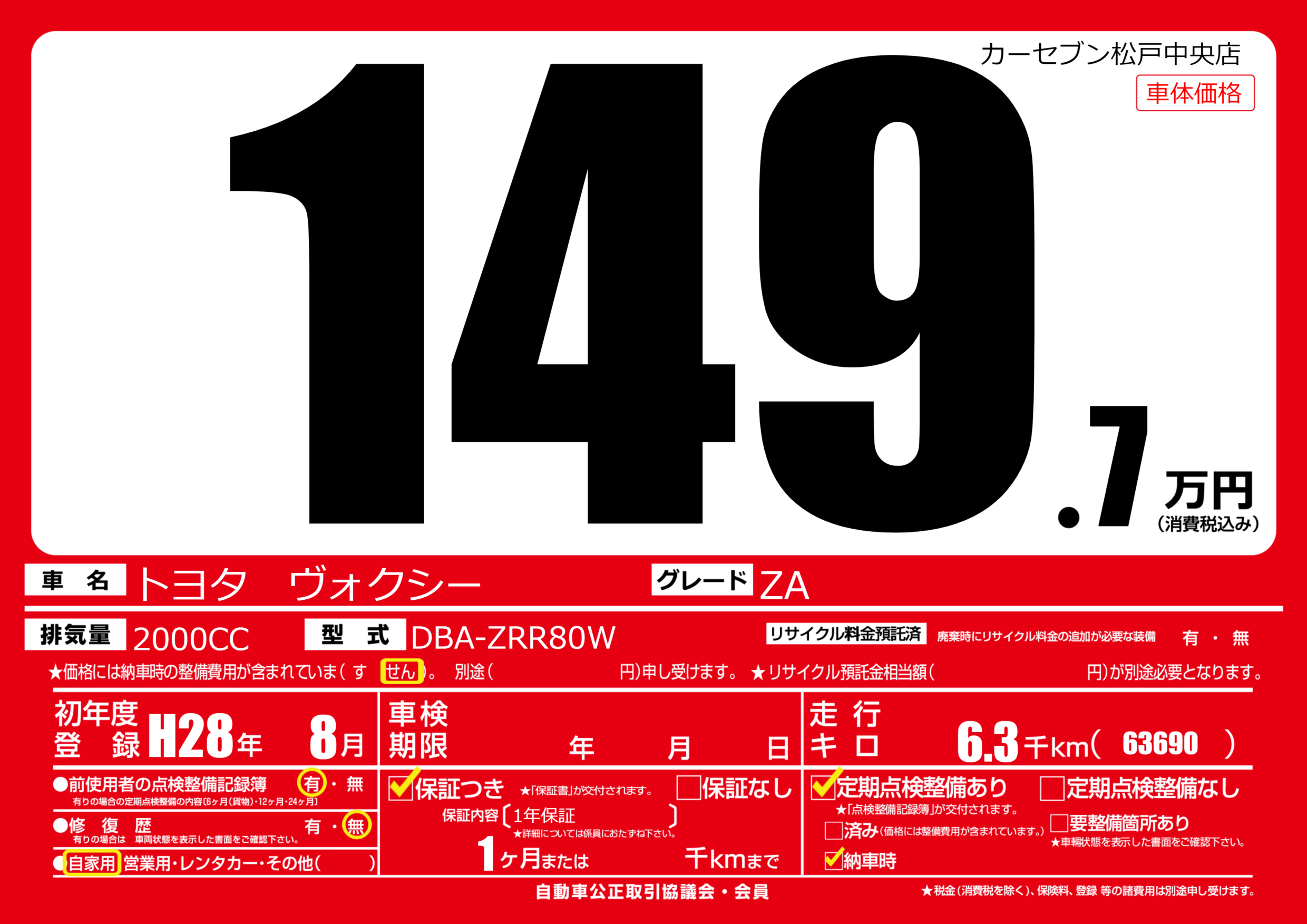 | 車名 | トヨタ ヴォクシー | グレード ミッション 排気量 |