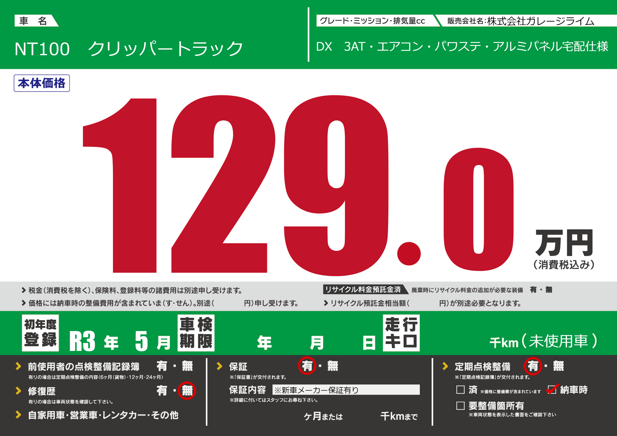 保証付き 保証内容(※新車メーカー保証有り) ---ヶ月または()千kmまで |