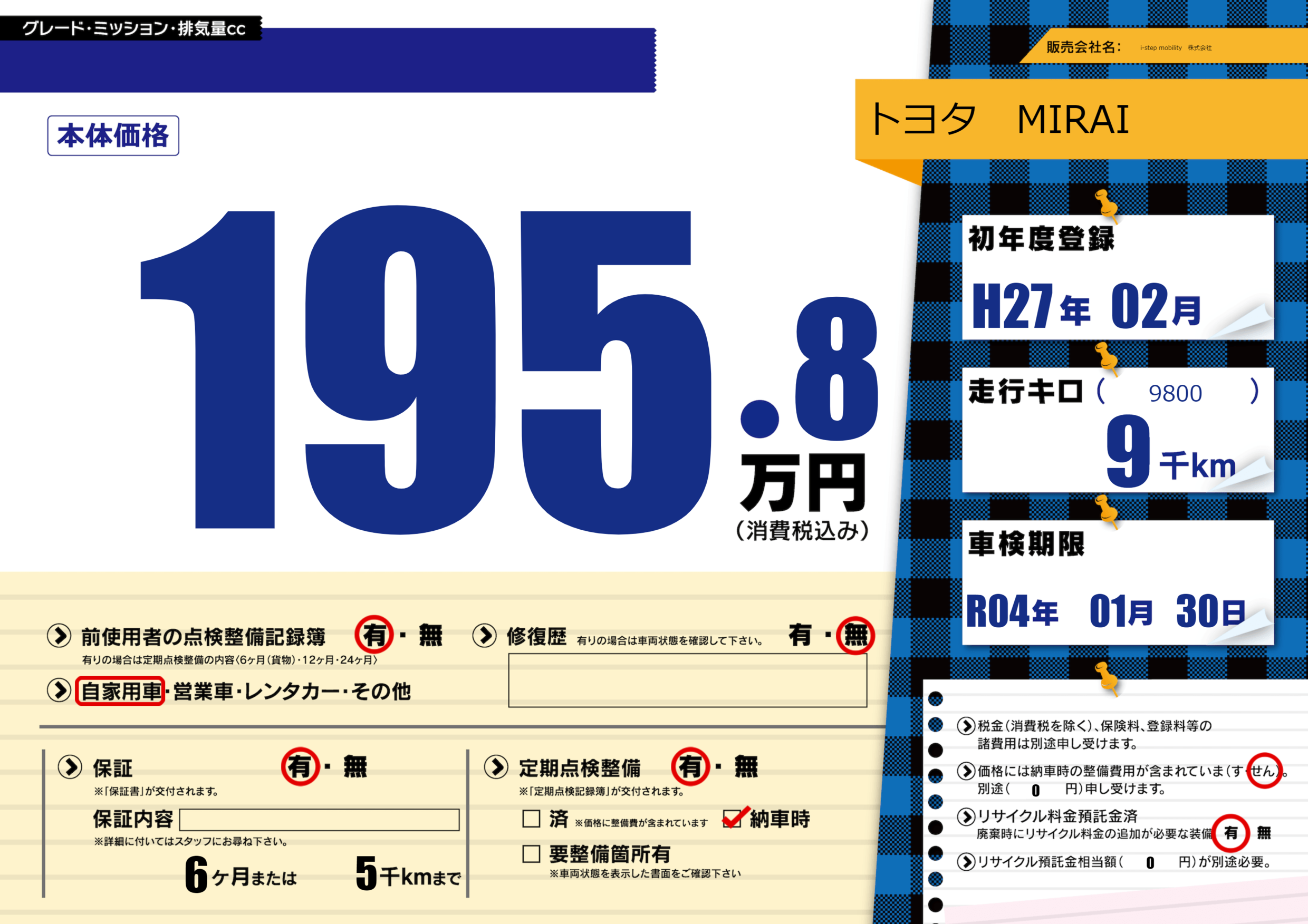 | 車名 | トヨタ MIRAI | グレード ミッション 排気量 |