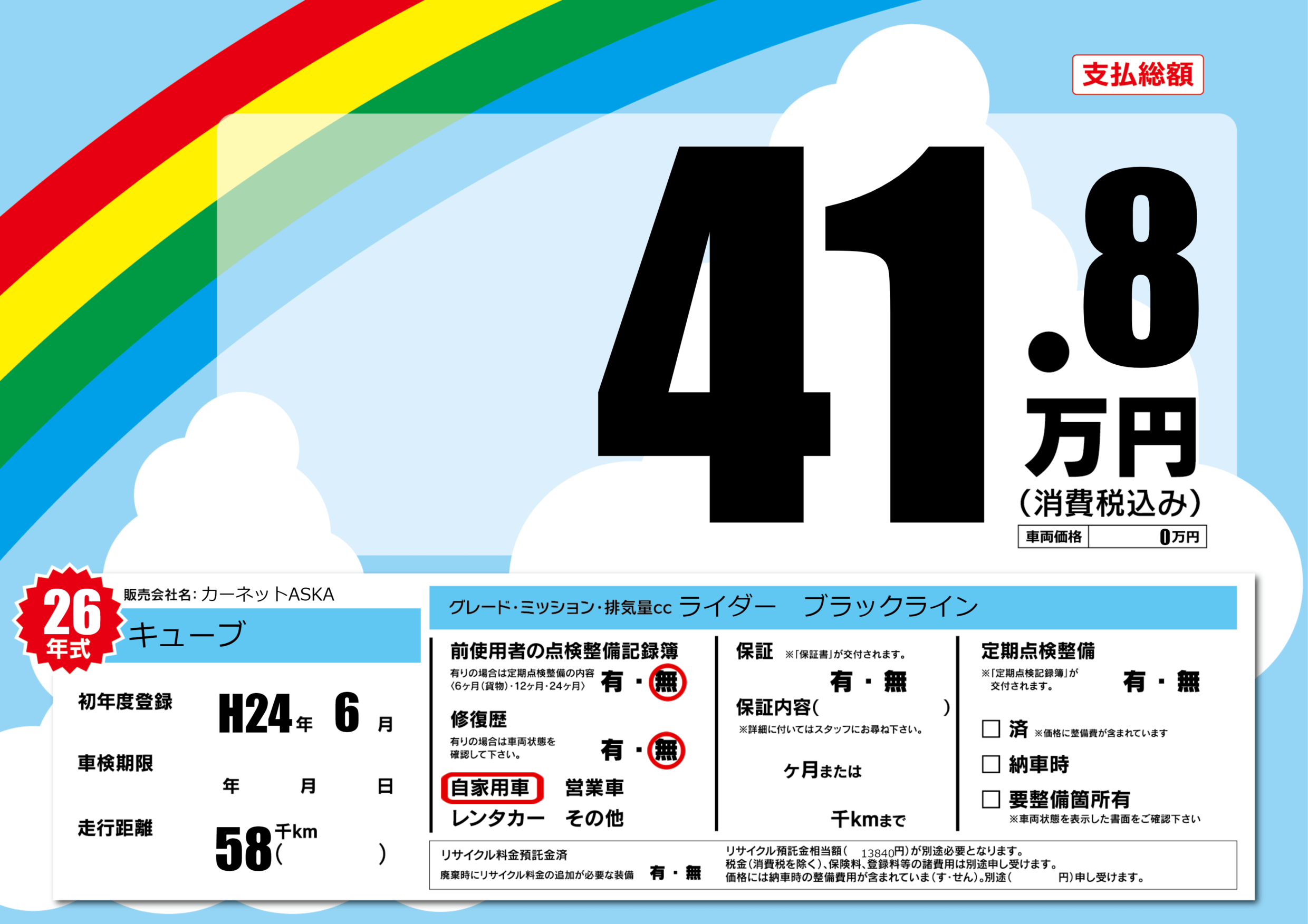 | 車名 | キューブ | グレード ミッション 排気量 |