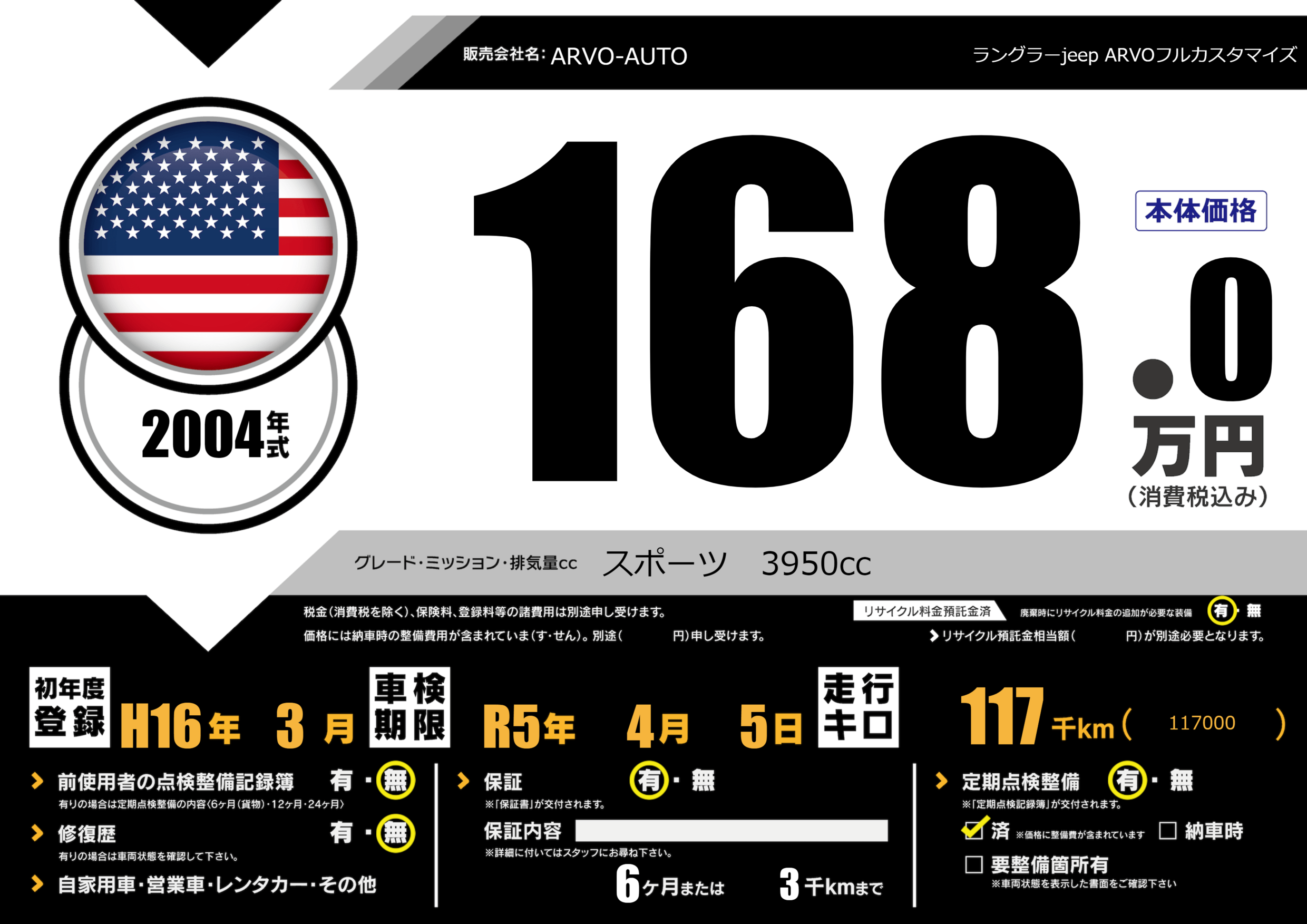 | 車名 | ラングラーjeep ARVOフルカスタマイズ | グレード ミッション 排気量 |