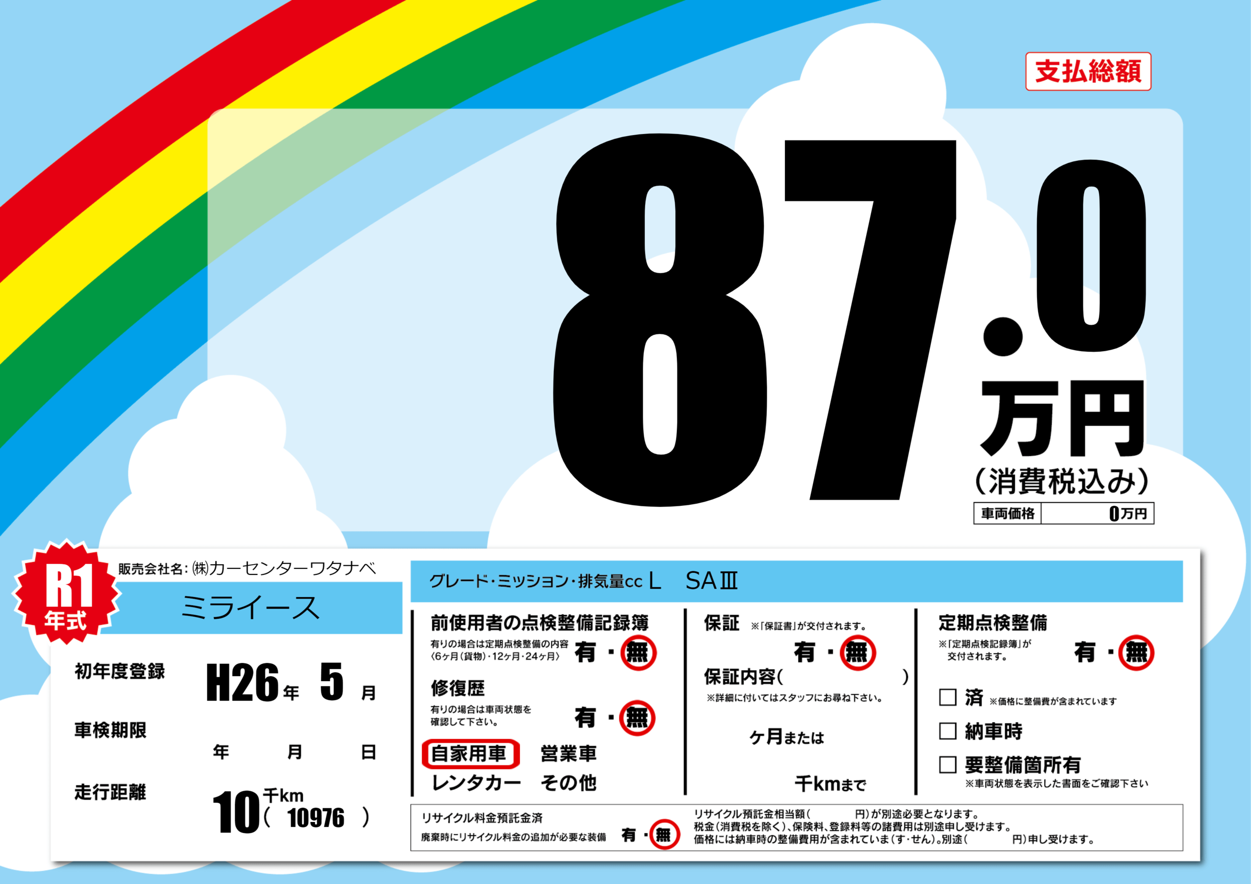 | 走行キロ | 1万km | 初年度登録 | H26年5月 |