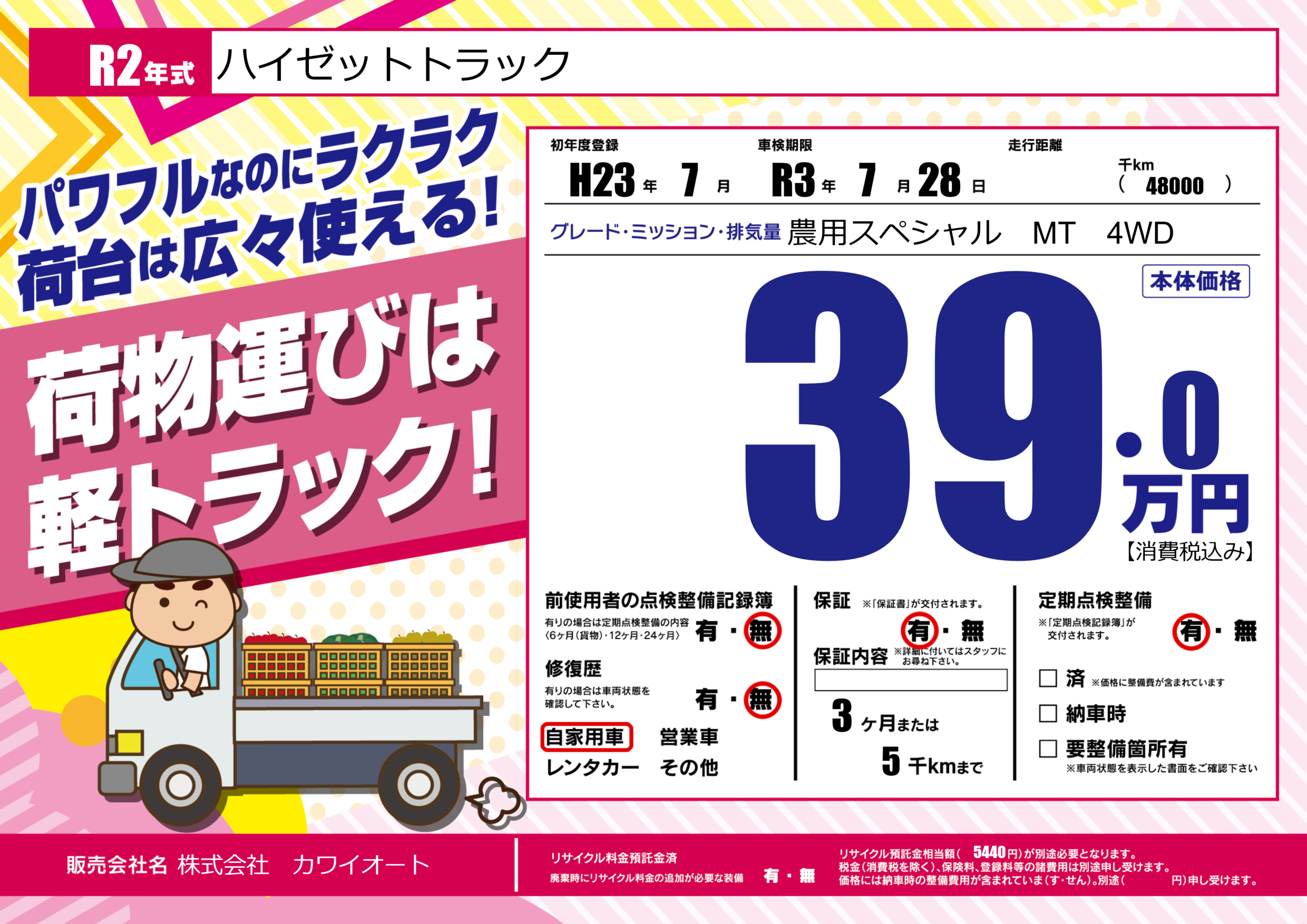 | 車名 | ハイゼットトラック | グレード ミッション 排気量 |