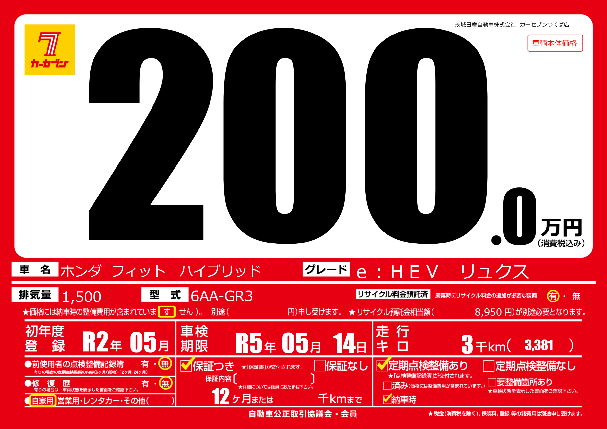 | 車名 | ホンダ フィット ハイブリッド | グレード ミッション 排気量 |