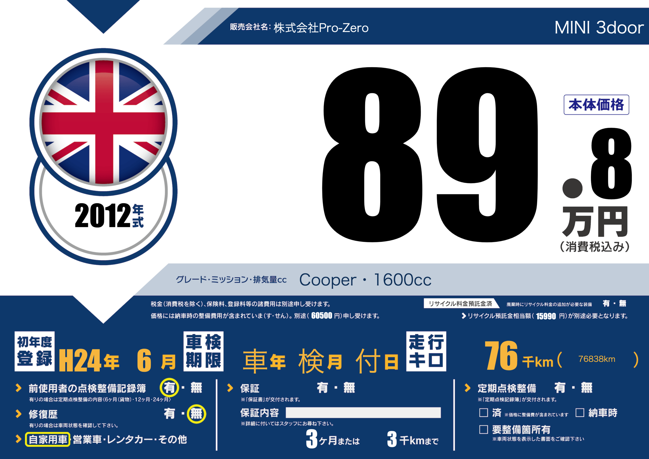 | 車名 | MINI 3door | グレード ミッション 排気量 |