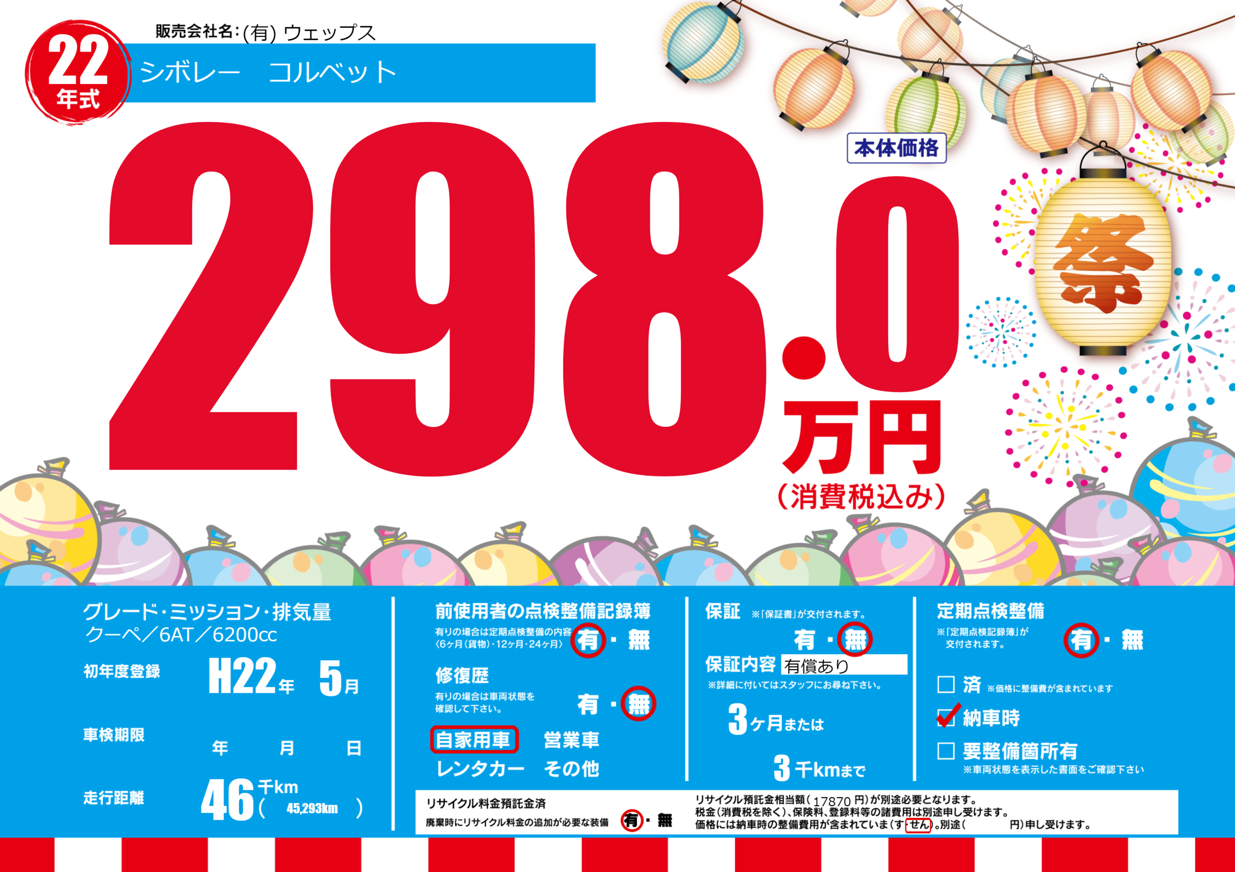 | 車名 | シボレー コルベット | グレード ミッション 排気量 |