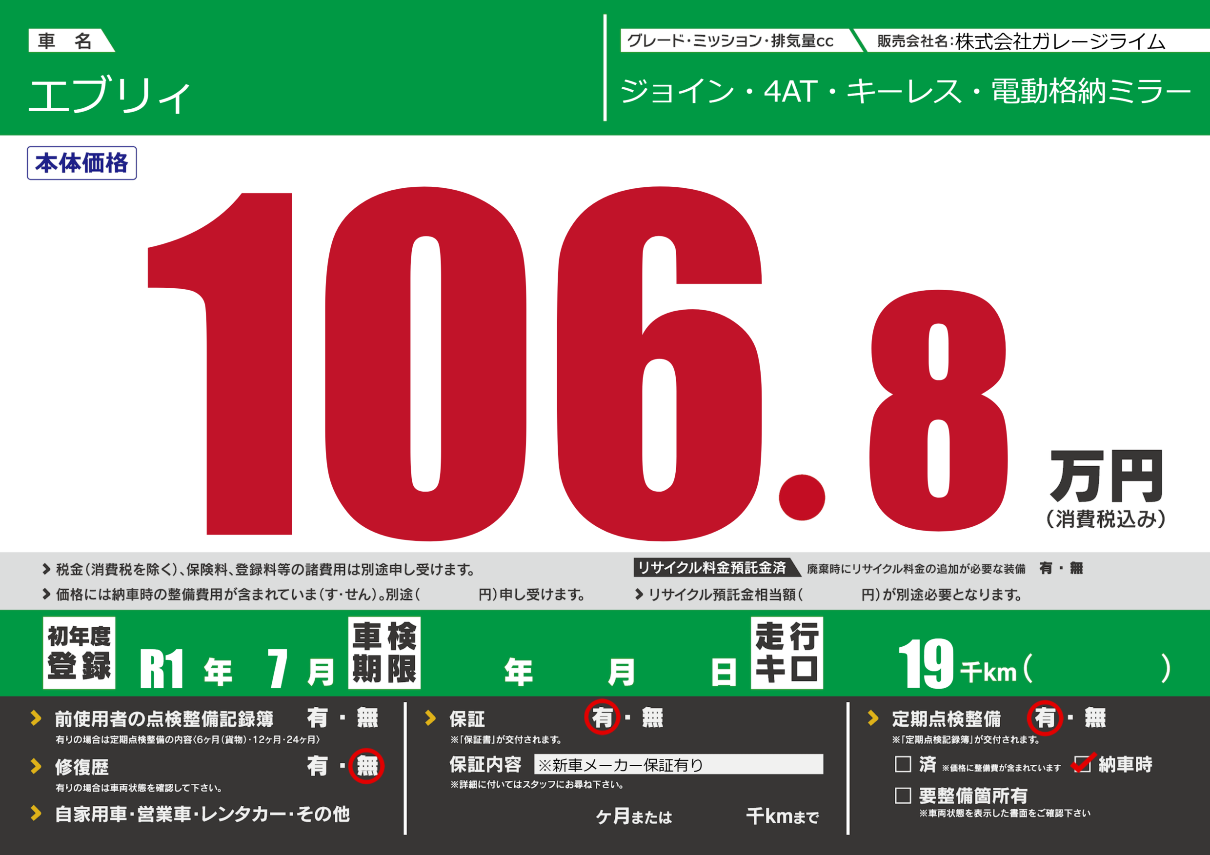 | 定期点検整備 | 定期点検整備あり 納車時あり | ||