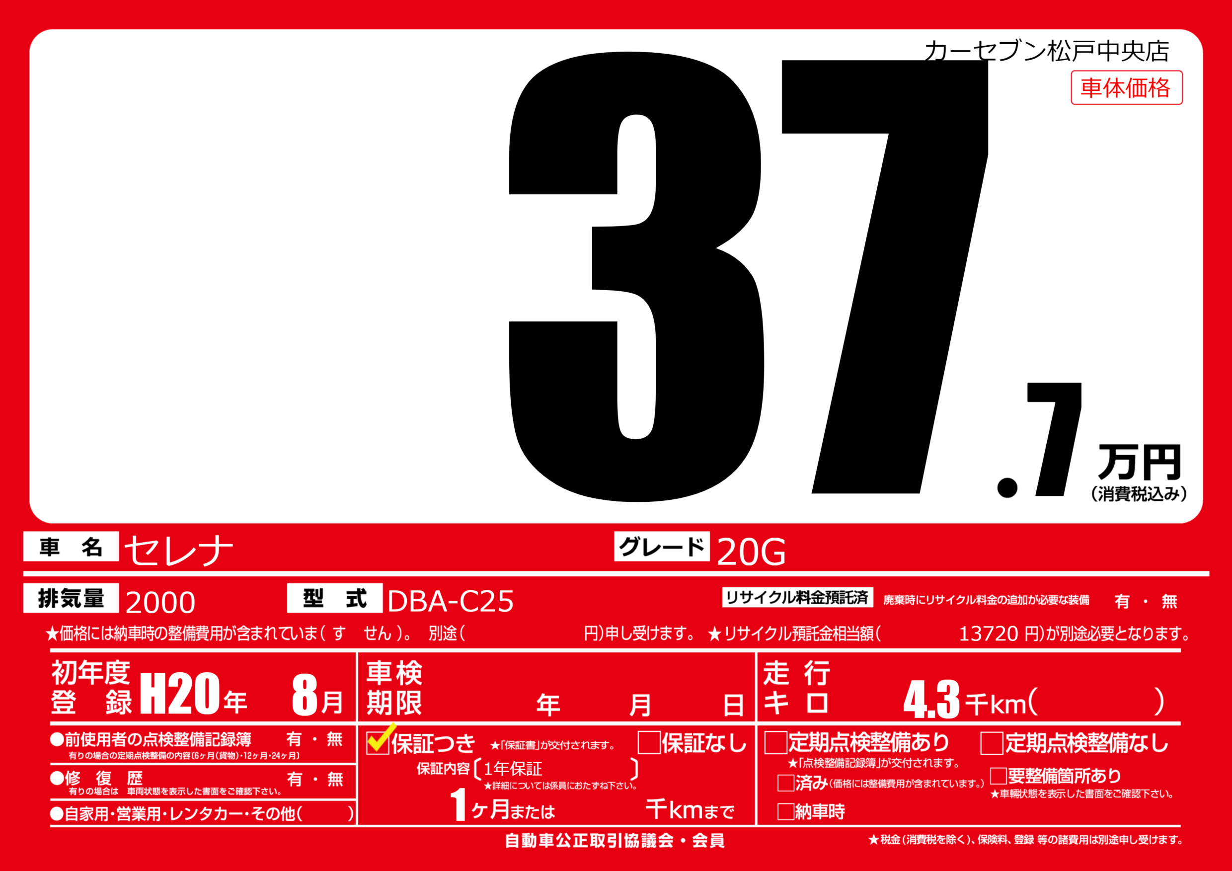 初年度登録 H20年8月