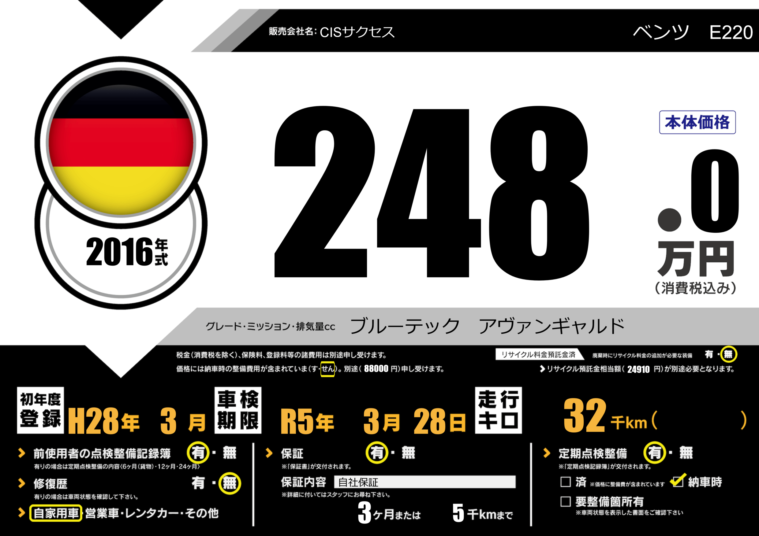 | 車名 | ベンツ E220 | グレード ミッション 排気量 |