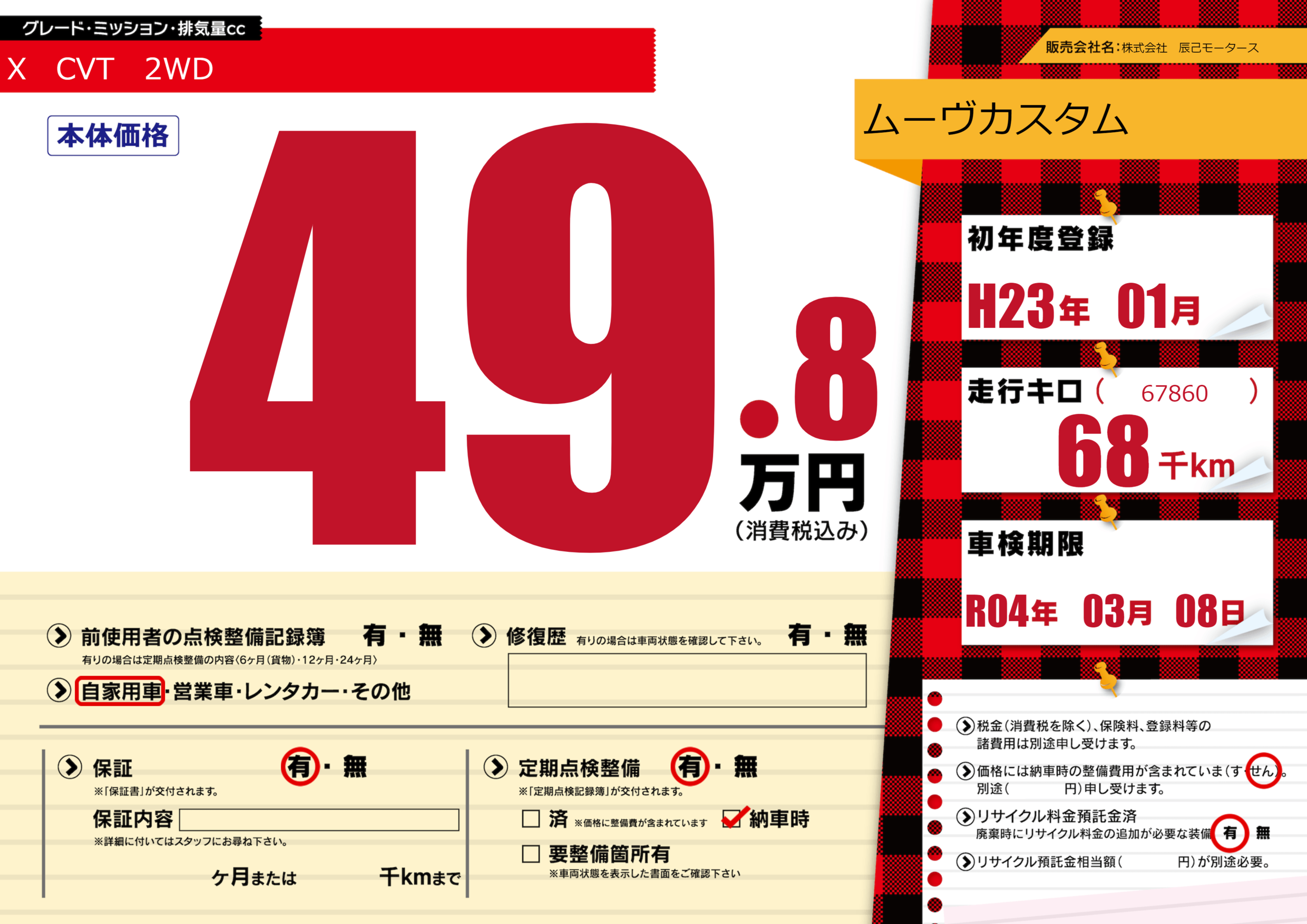 | 走行キロ | 6.8万km | 初年度登録 | H23年01月 |
