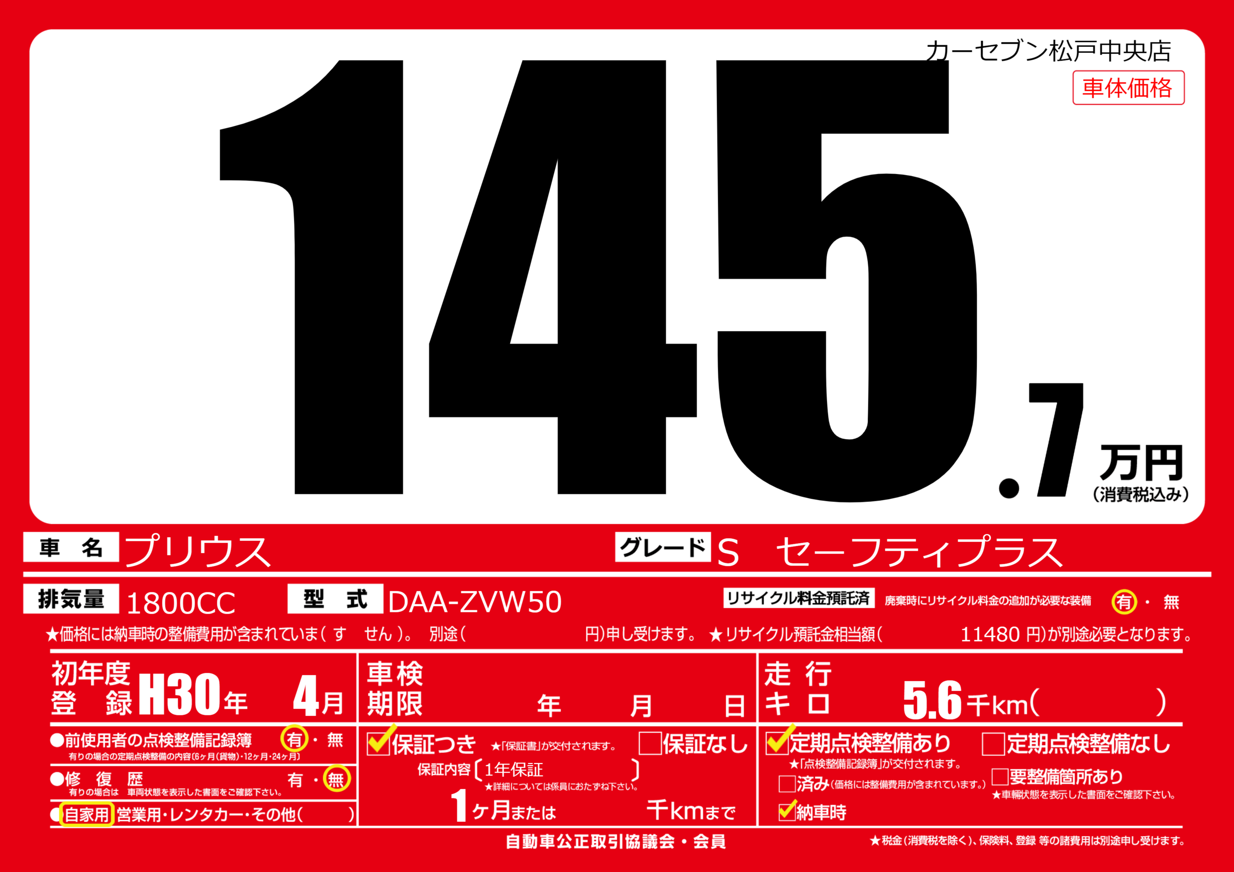 | 車名 | プリウス | グレード ミッション 排気量 |