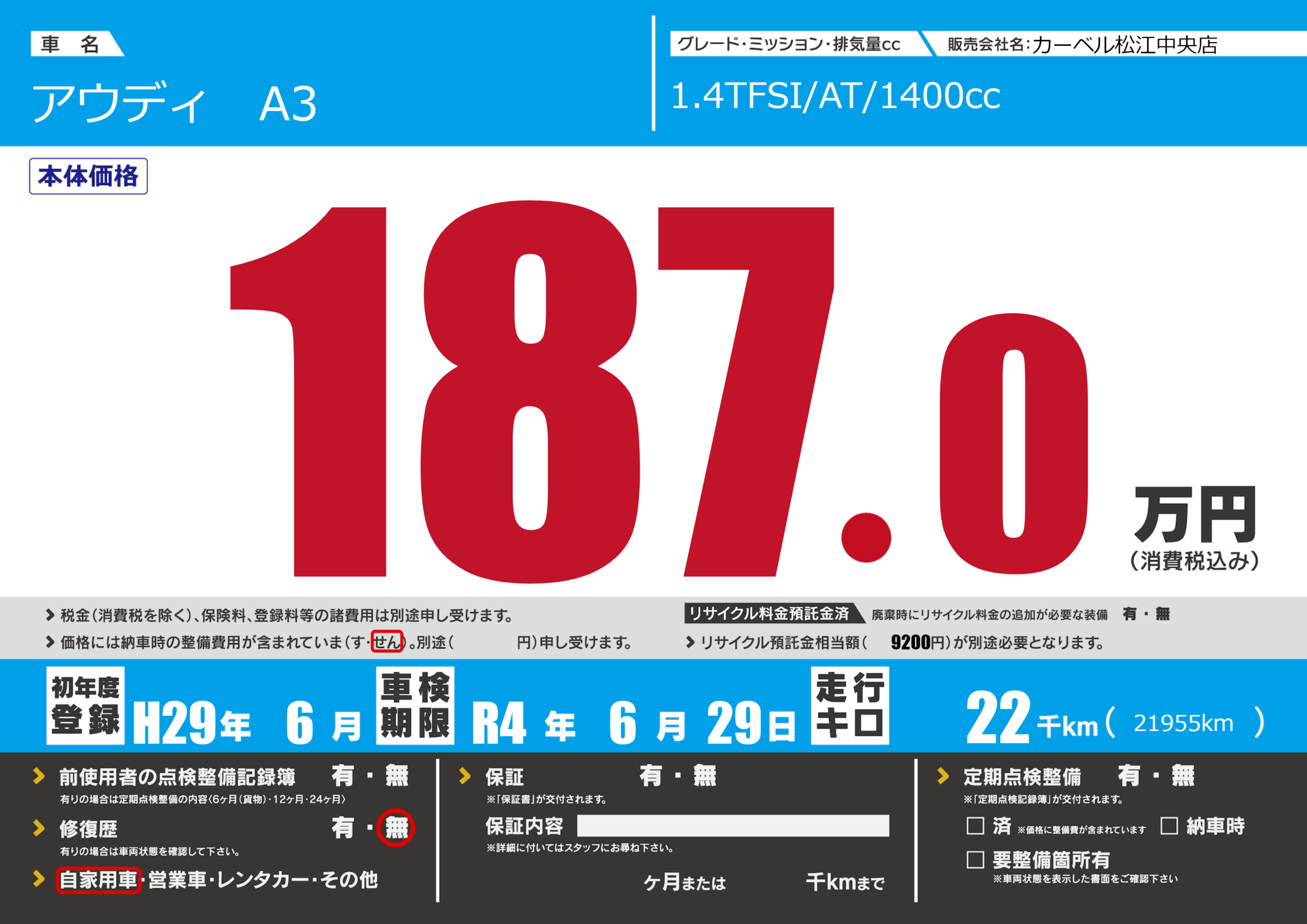 | 車名 | アウディ A3 | グレード ミッション 排気量 |