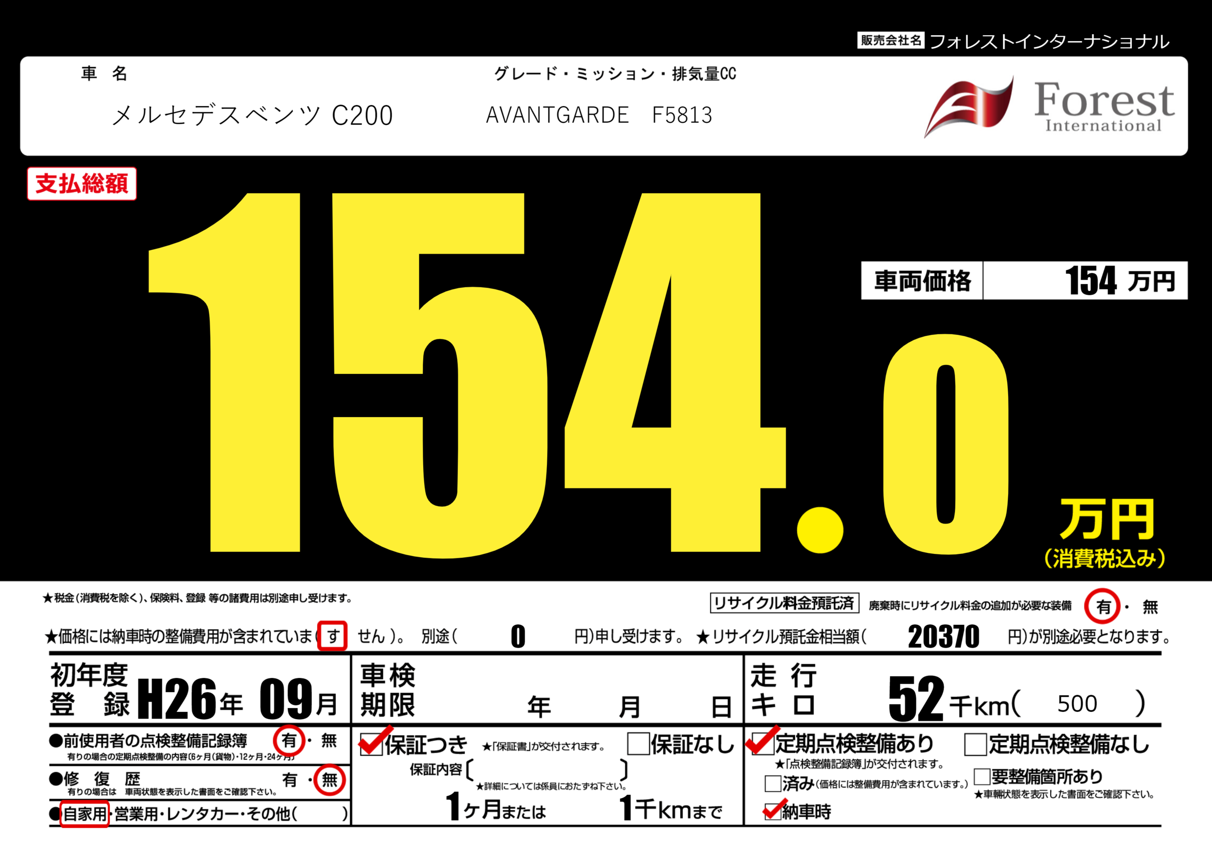 | 車名 | メルセデスベンツ C200 | グレード ミッション 排気量 |
