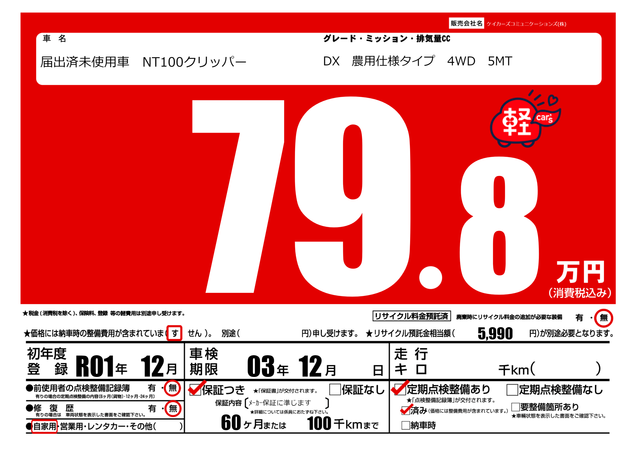 | 車名 | 届出済未使用車 NT100クリッパー | グレード ミッション 排気量 |