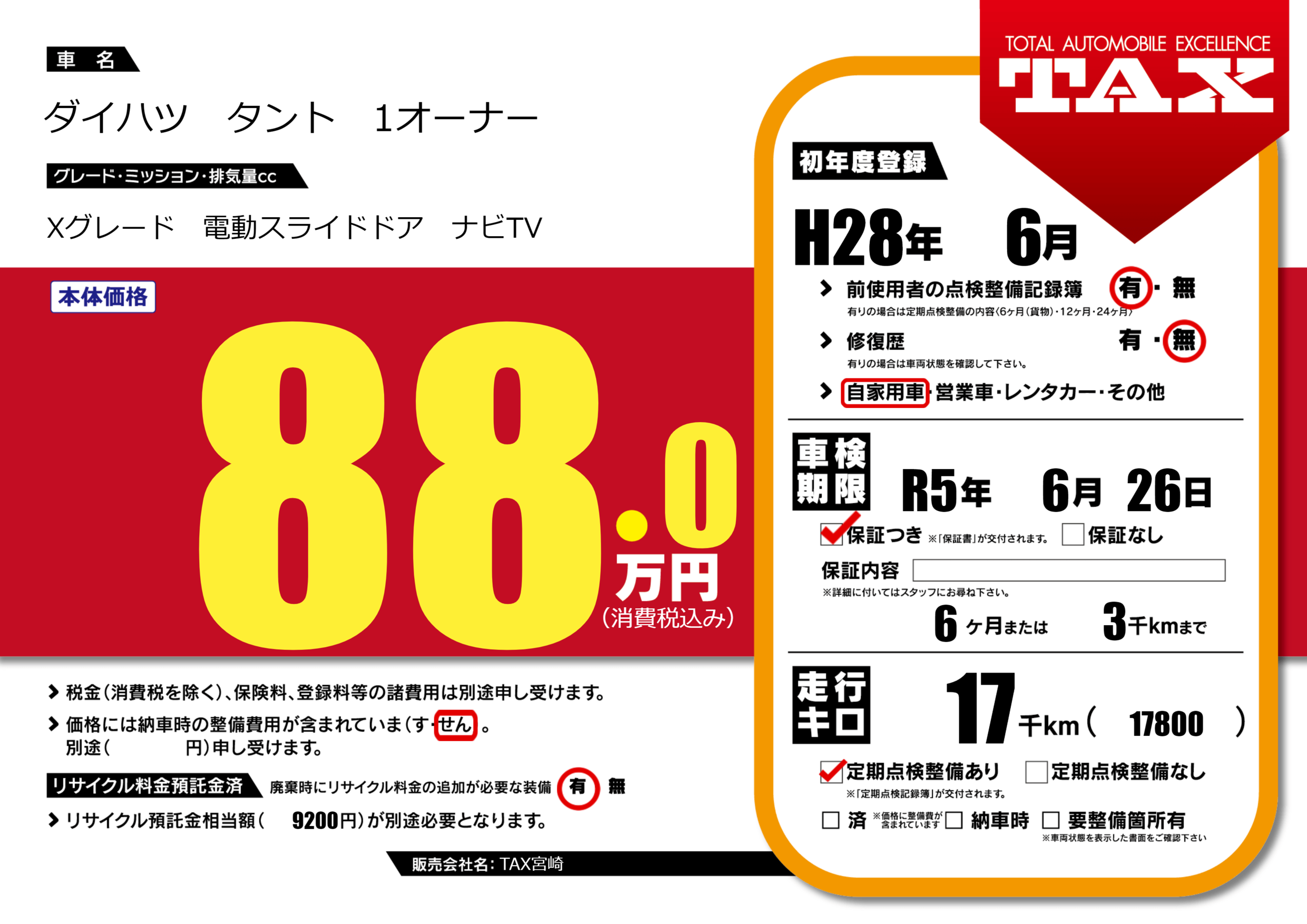 | 車名 | ダイハツ タント 1オーナー | グレード ミッション 排気量 |