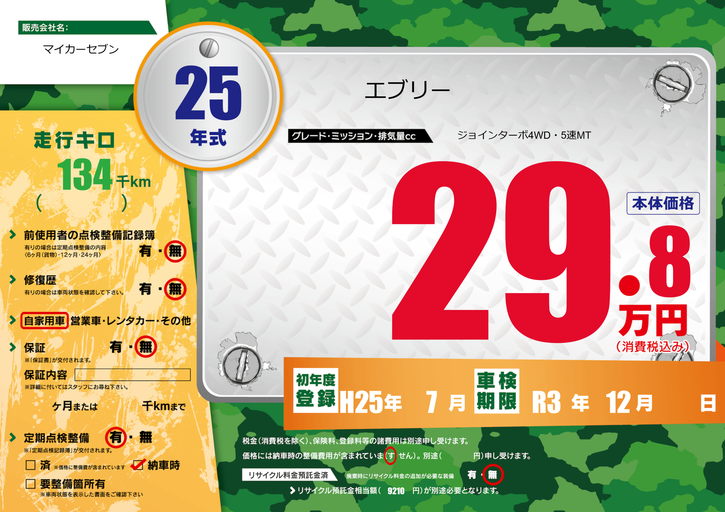 | 車名 | エブリー | グレード ミッション 排気量 |