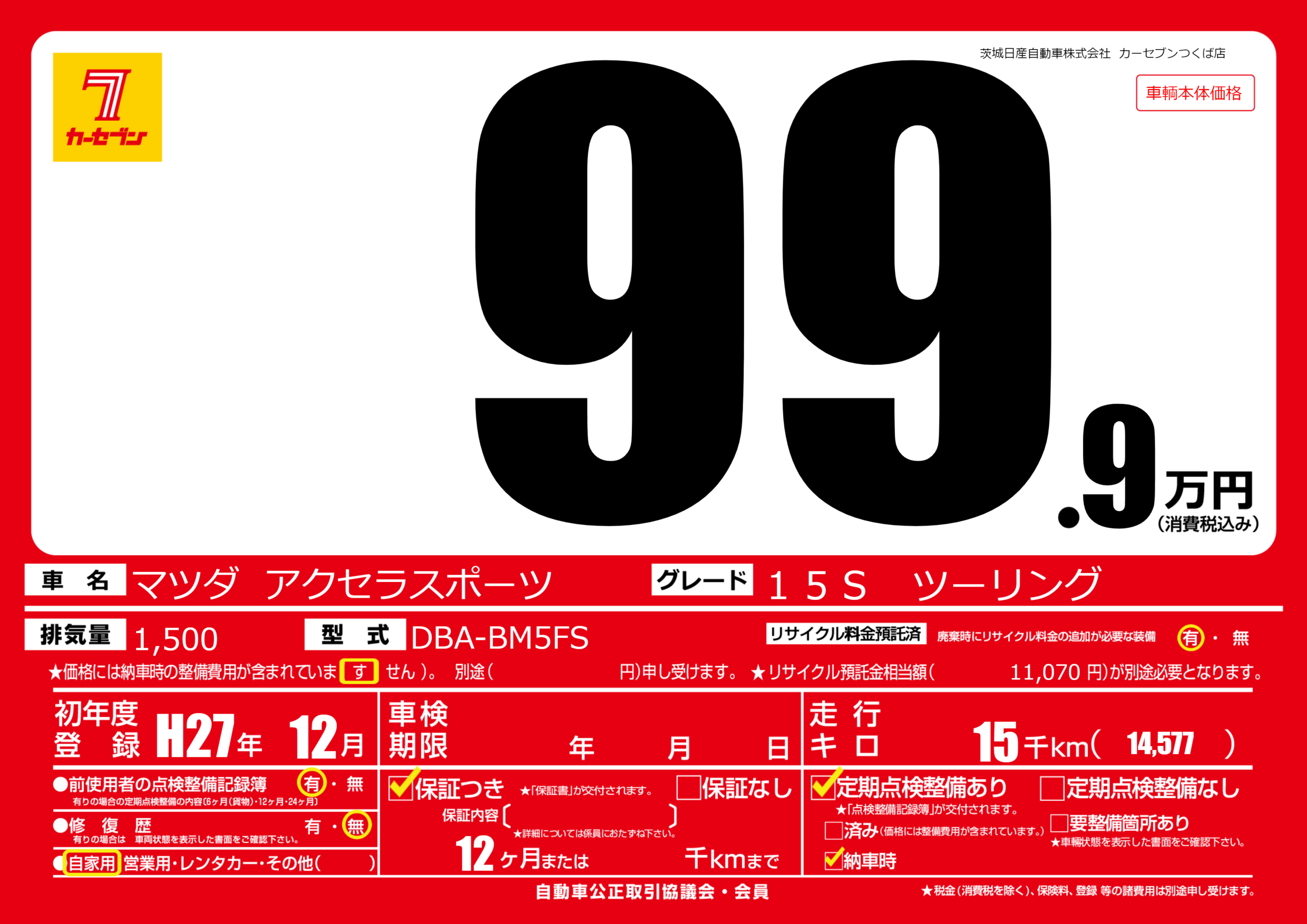 保証付き 保証内容(---) 12ヶ月または()千kmまで |