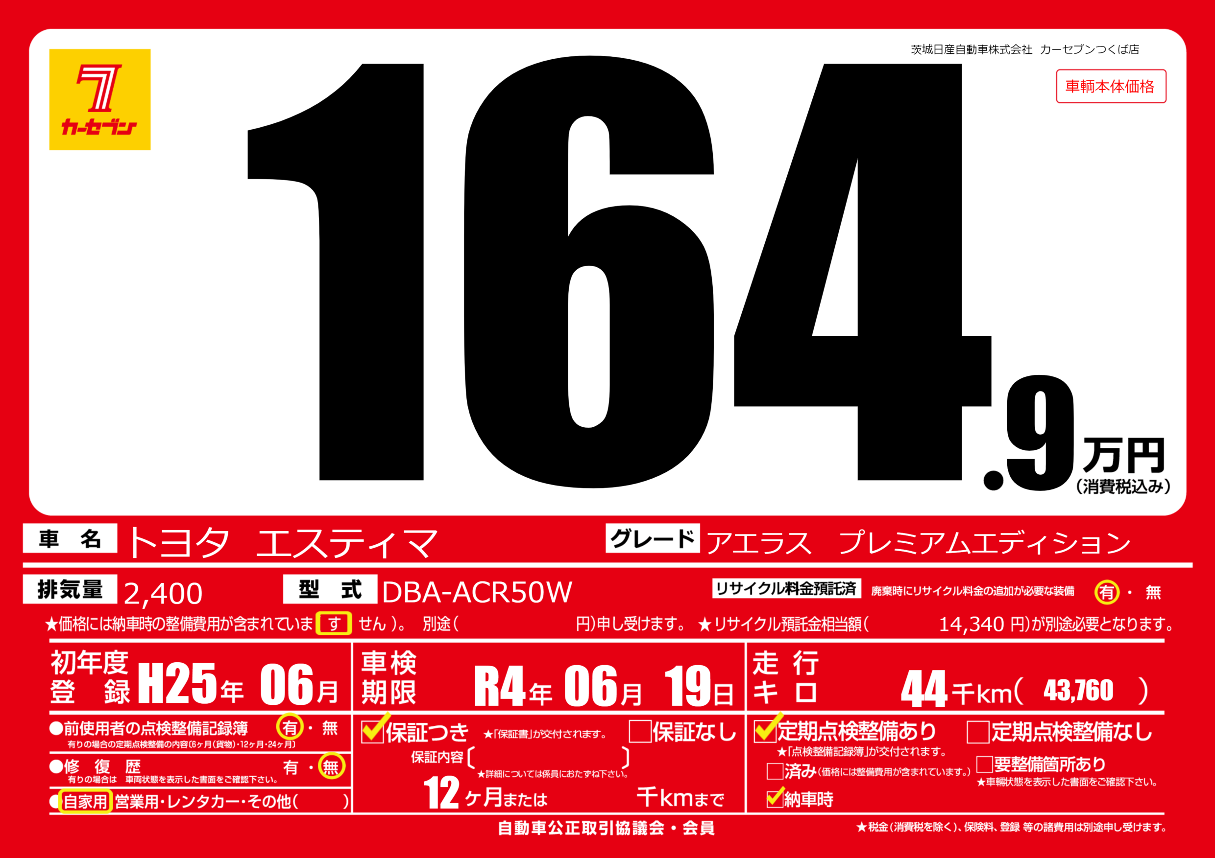 | 車名 | トヨタ エスティマ | グレード ミッション 排気量 |
