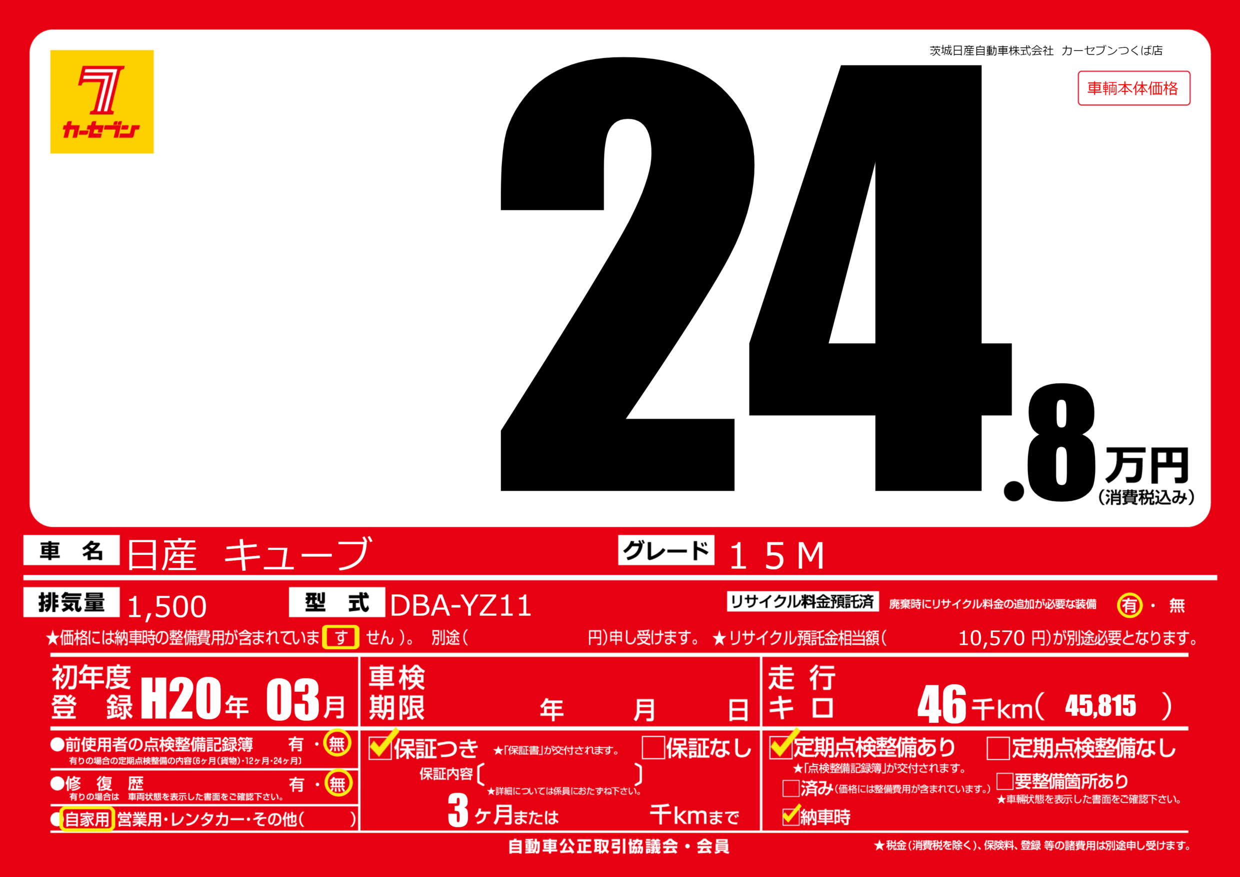 | 車名 | 日産 キューブ | グレード ミッション 排気量 |
