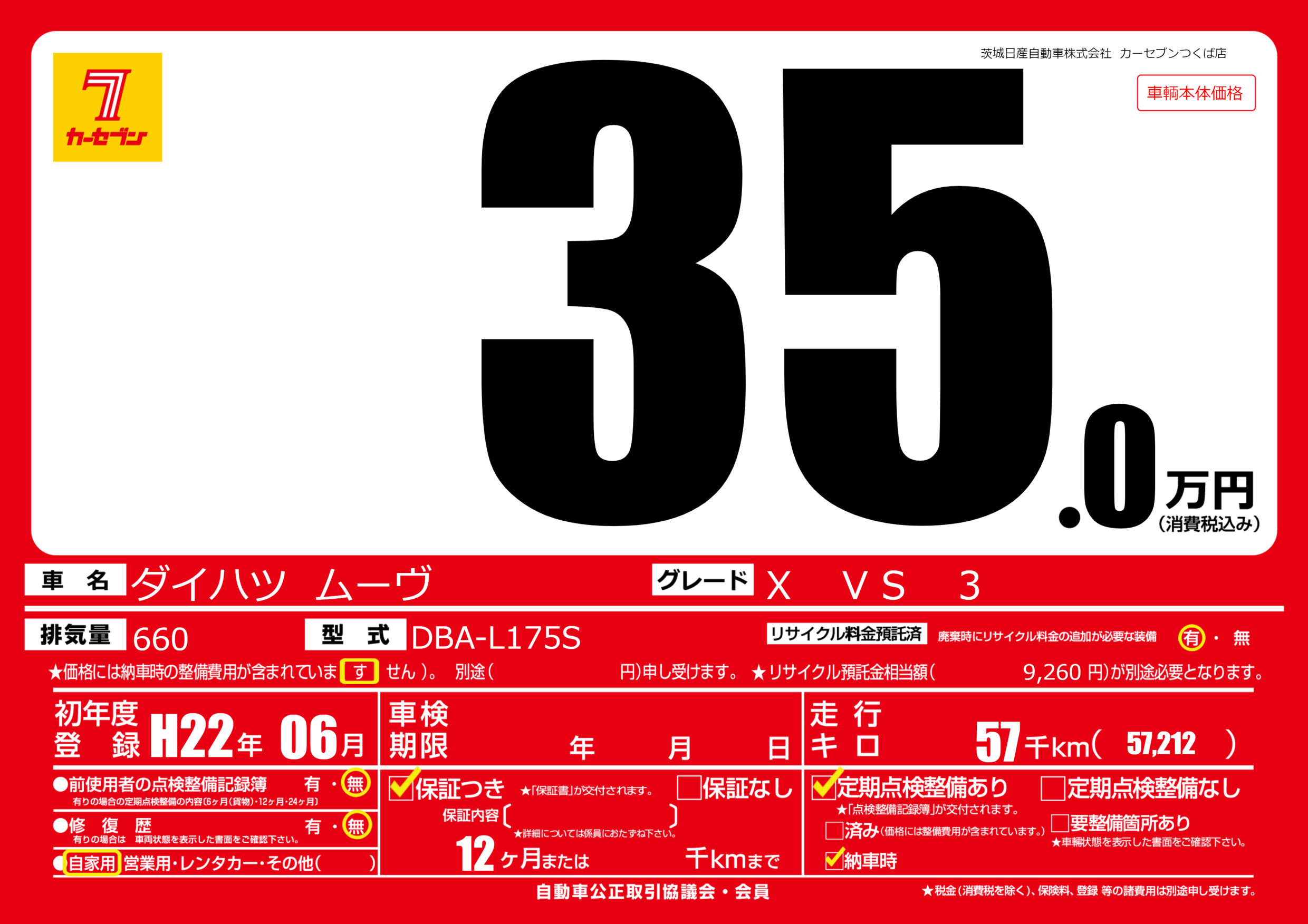 保証付き 保証内容(---) 12ヶ月または()千kmまで |