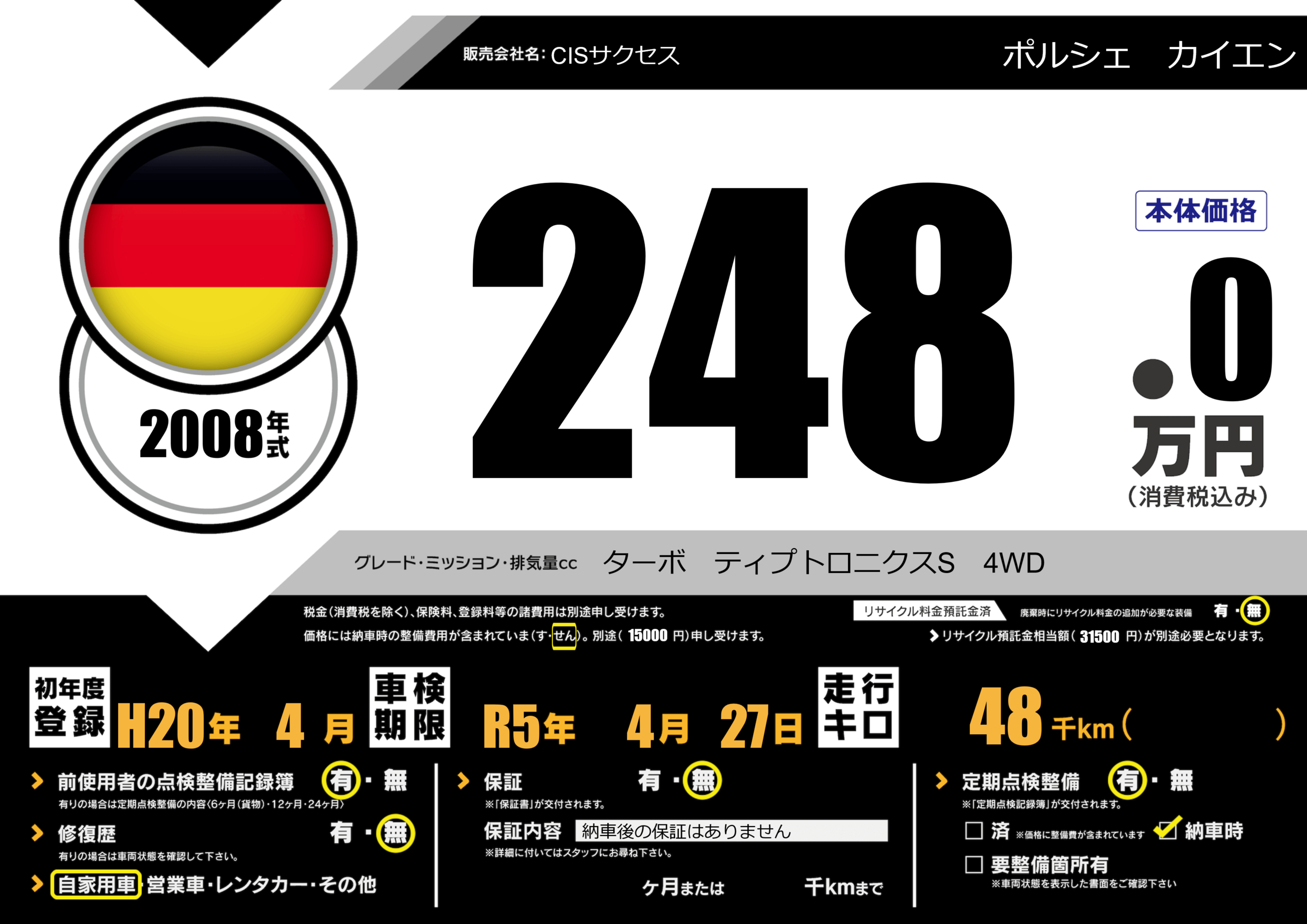 | 車名 | ポルシェ カイエン | グレード ミッション 排気量 |