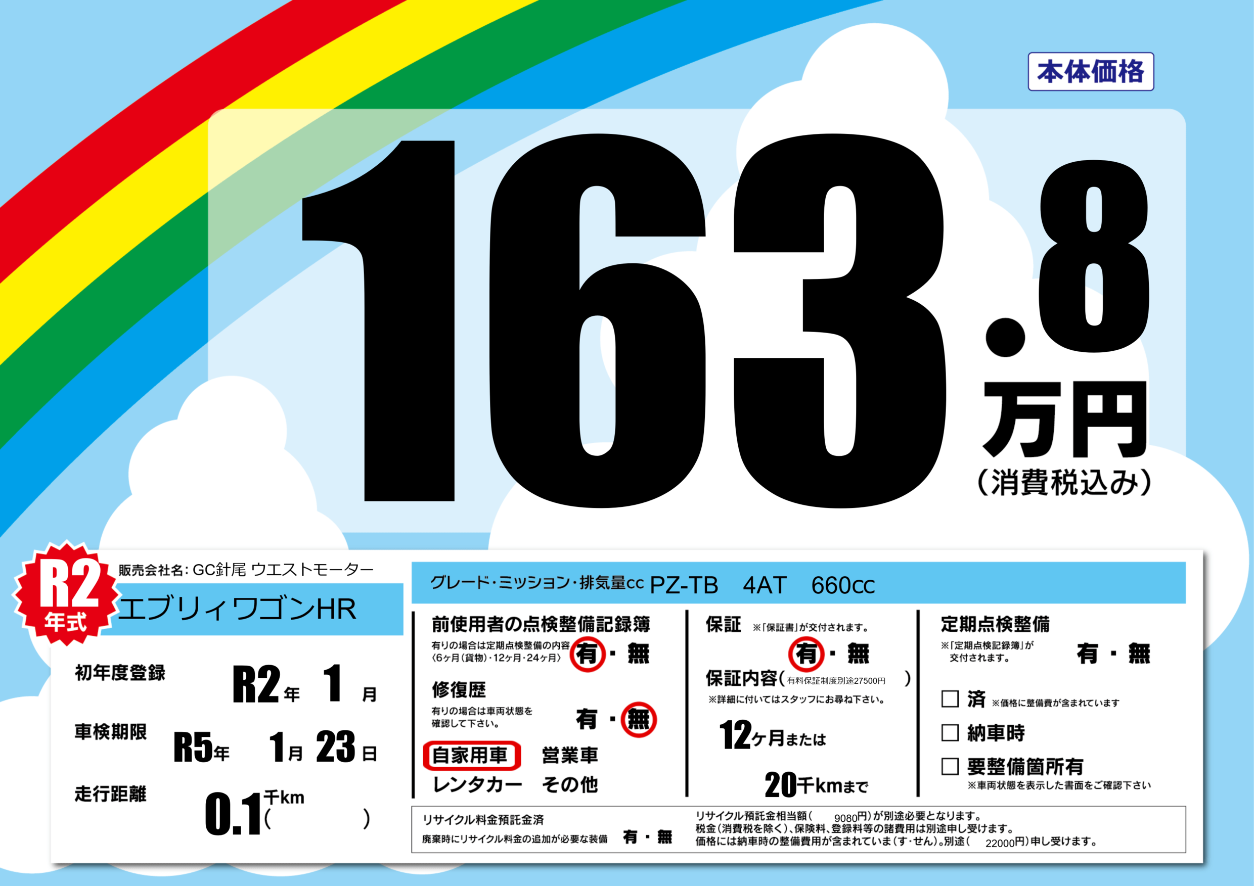 | 車名 | エブリィワゴンHR | グレード ミッション 排気量 |