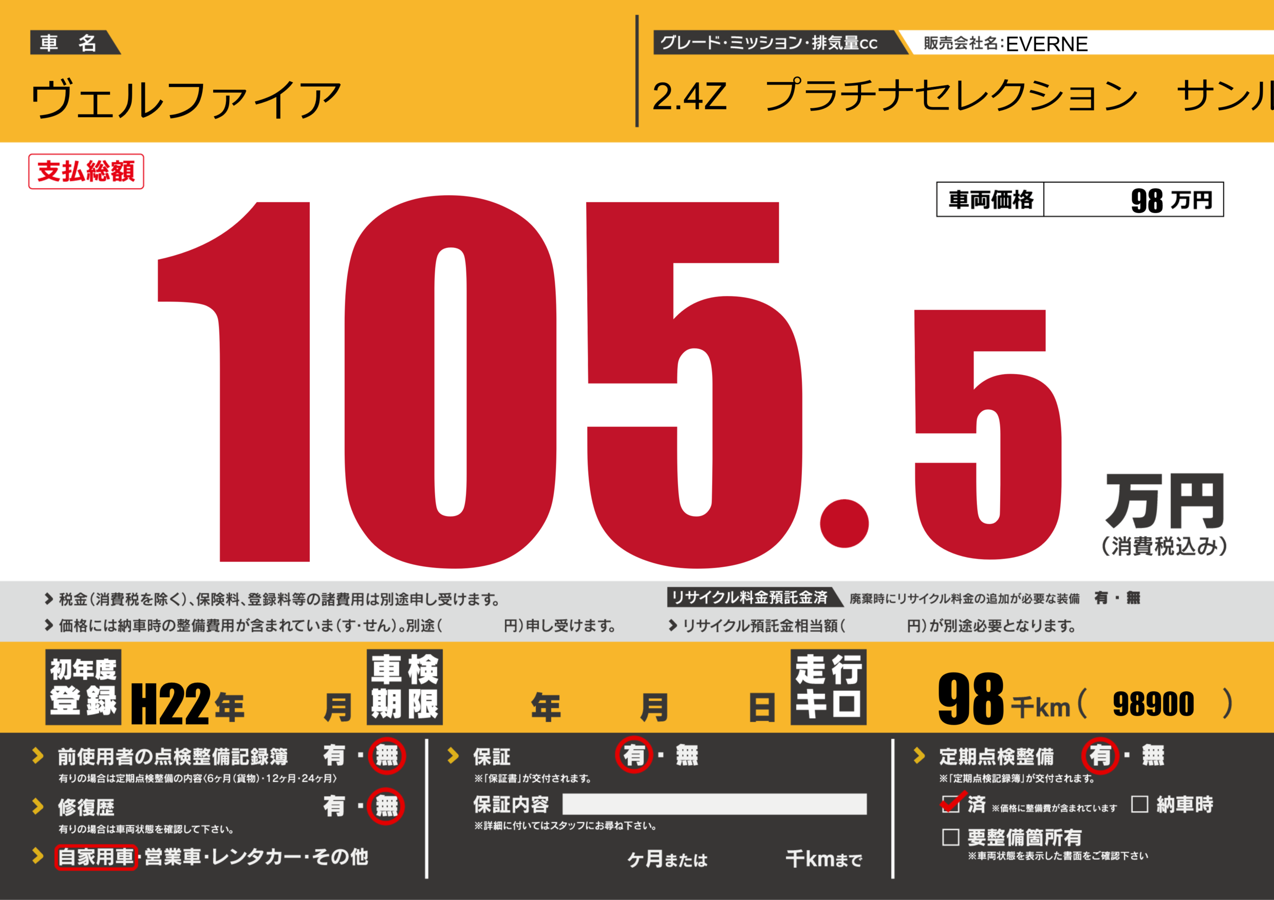 | 定期点検整備 | 定期点検整備あり 定期点検整備済み | ||