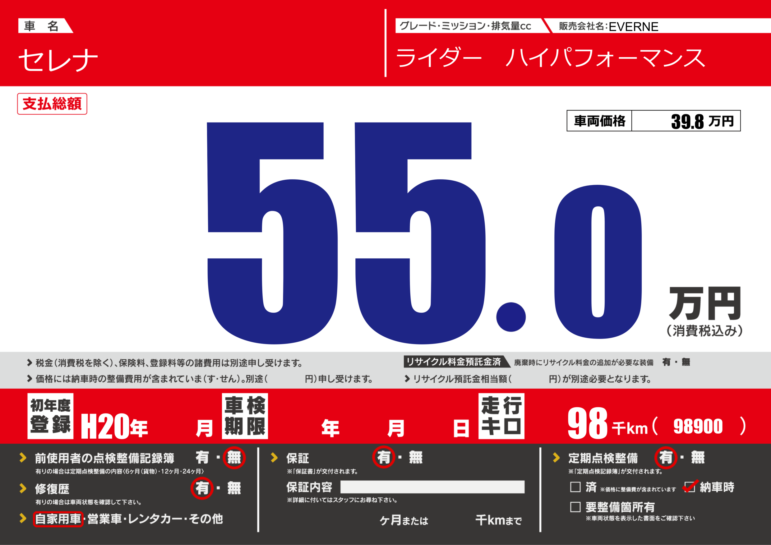| 定期点検整備 | 定期点検整備あり 納車時あり | ||