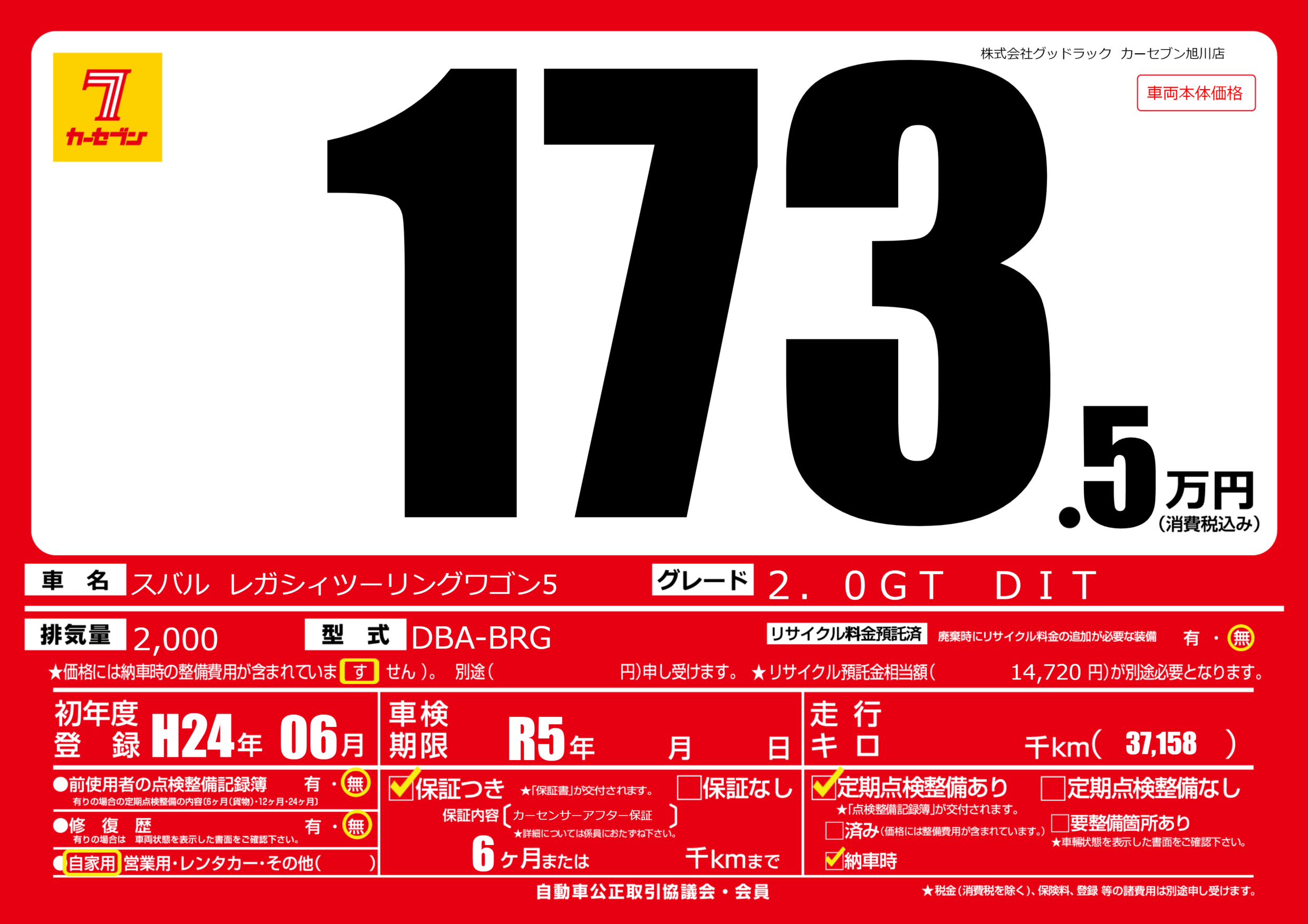 | 車名 | スバル レガシィツーリングワゴン5 | グレード ミッション 排気量 |