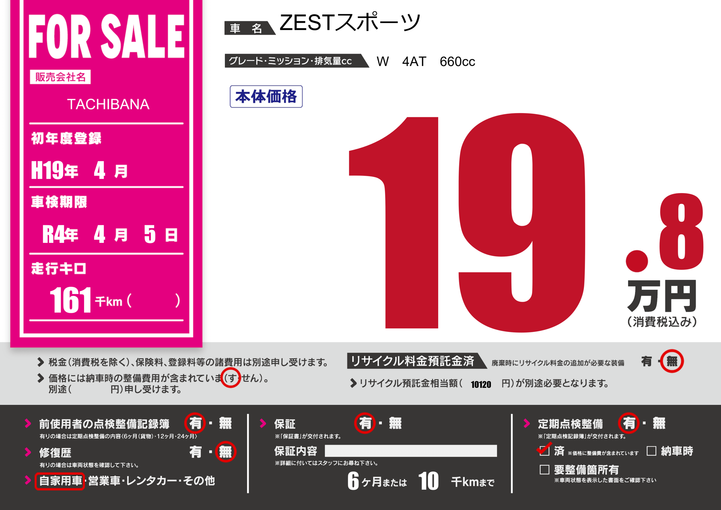 | 車名 | ZESTスポーツ | グレード ミッション 排気量 |
