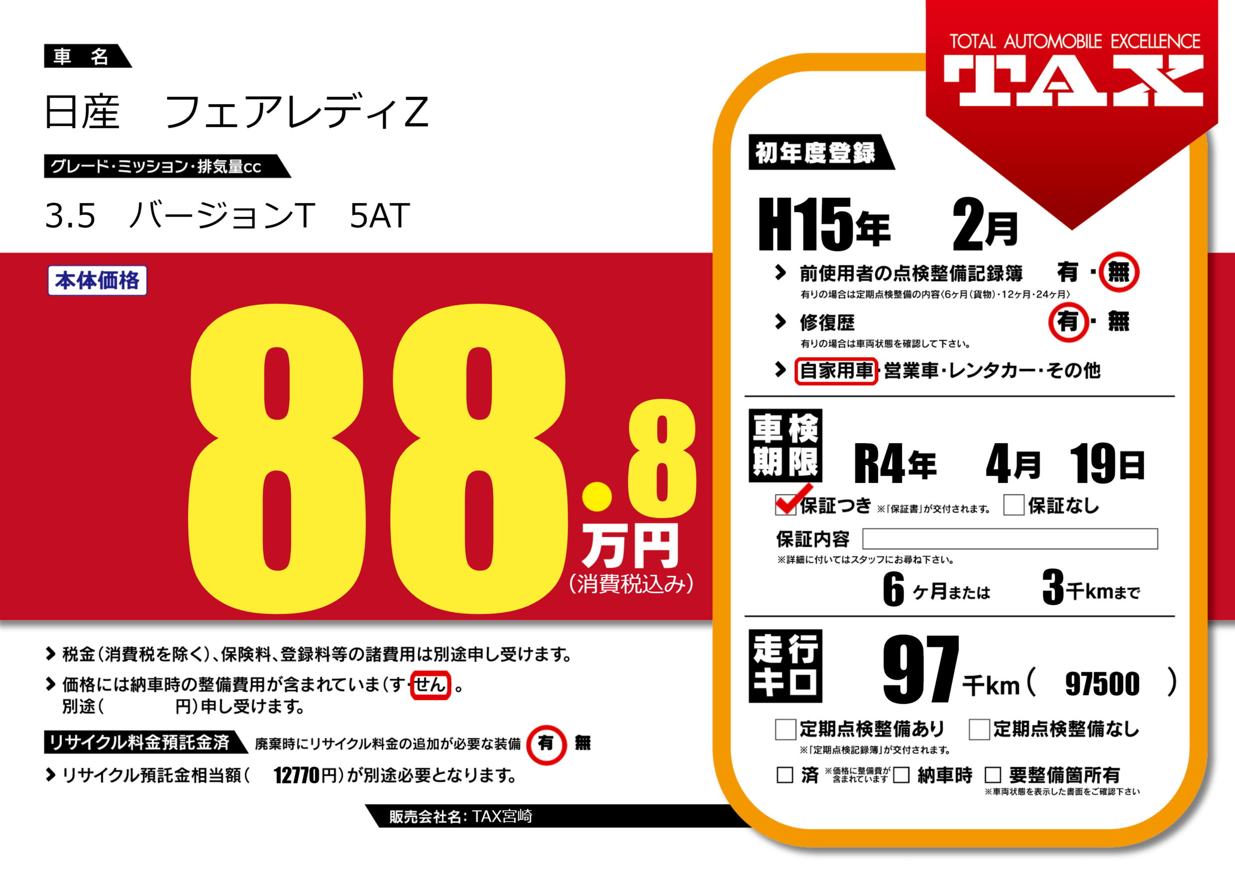 | 車名 | 日産 フェアレディZ | グレード ミッション 排気量 |
