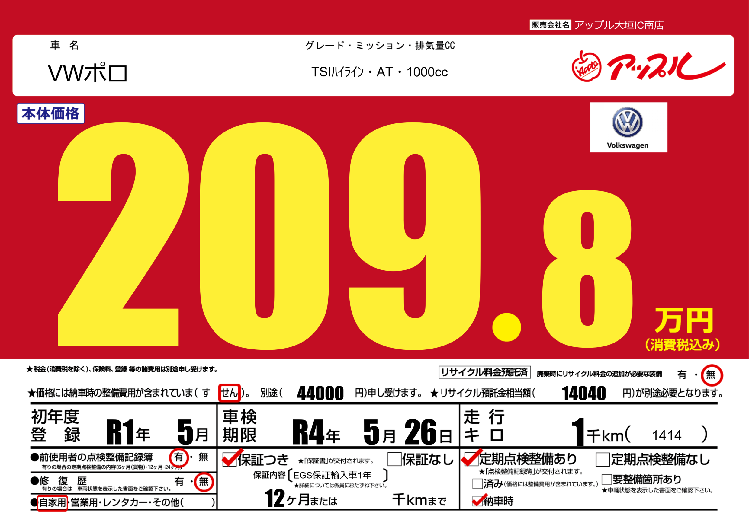 | 車名 | VWポロ | グレード ミッション 排気量 |