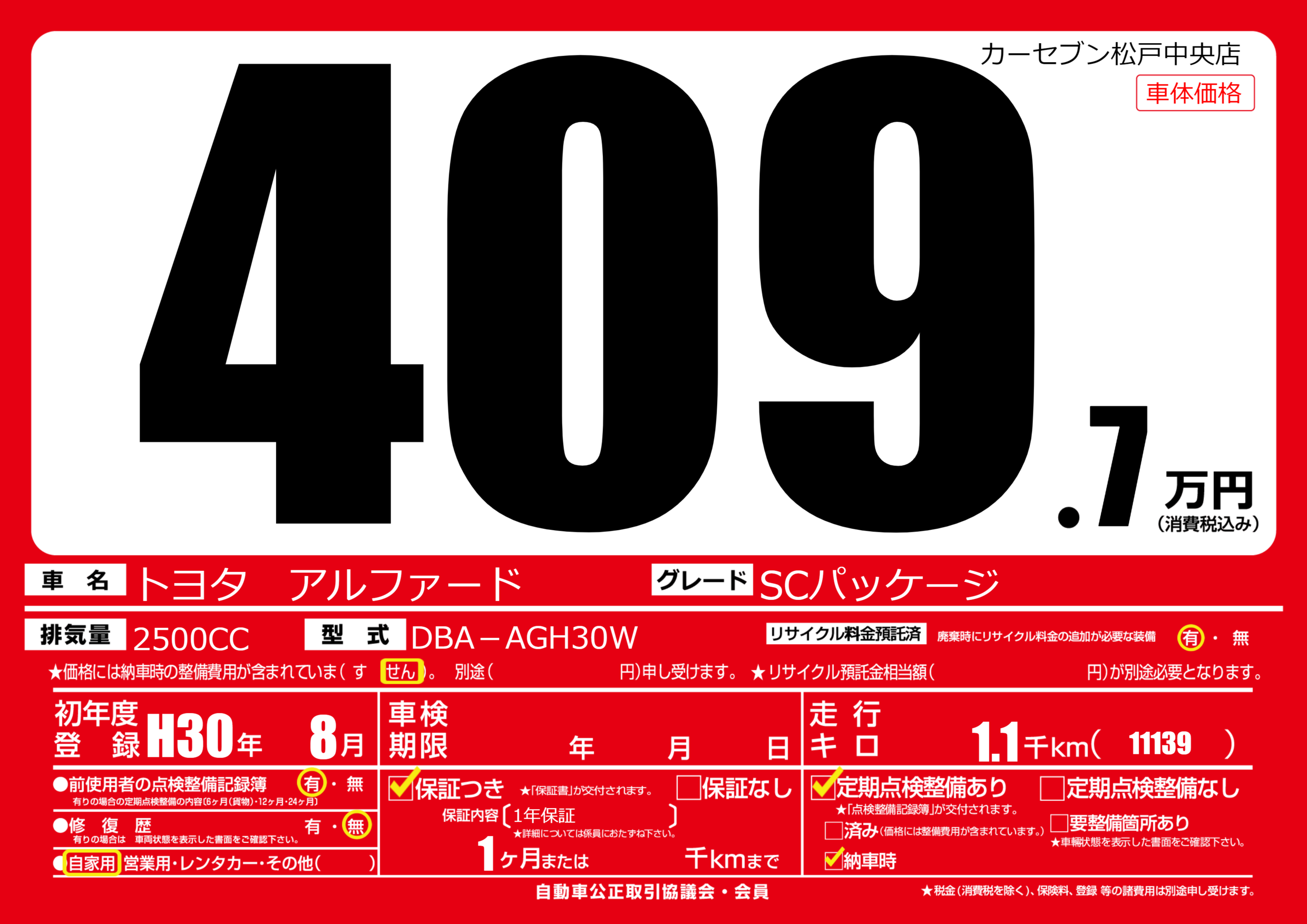 | 車名 | トヨタ アルファード | グレード ミッション 排気量 |