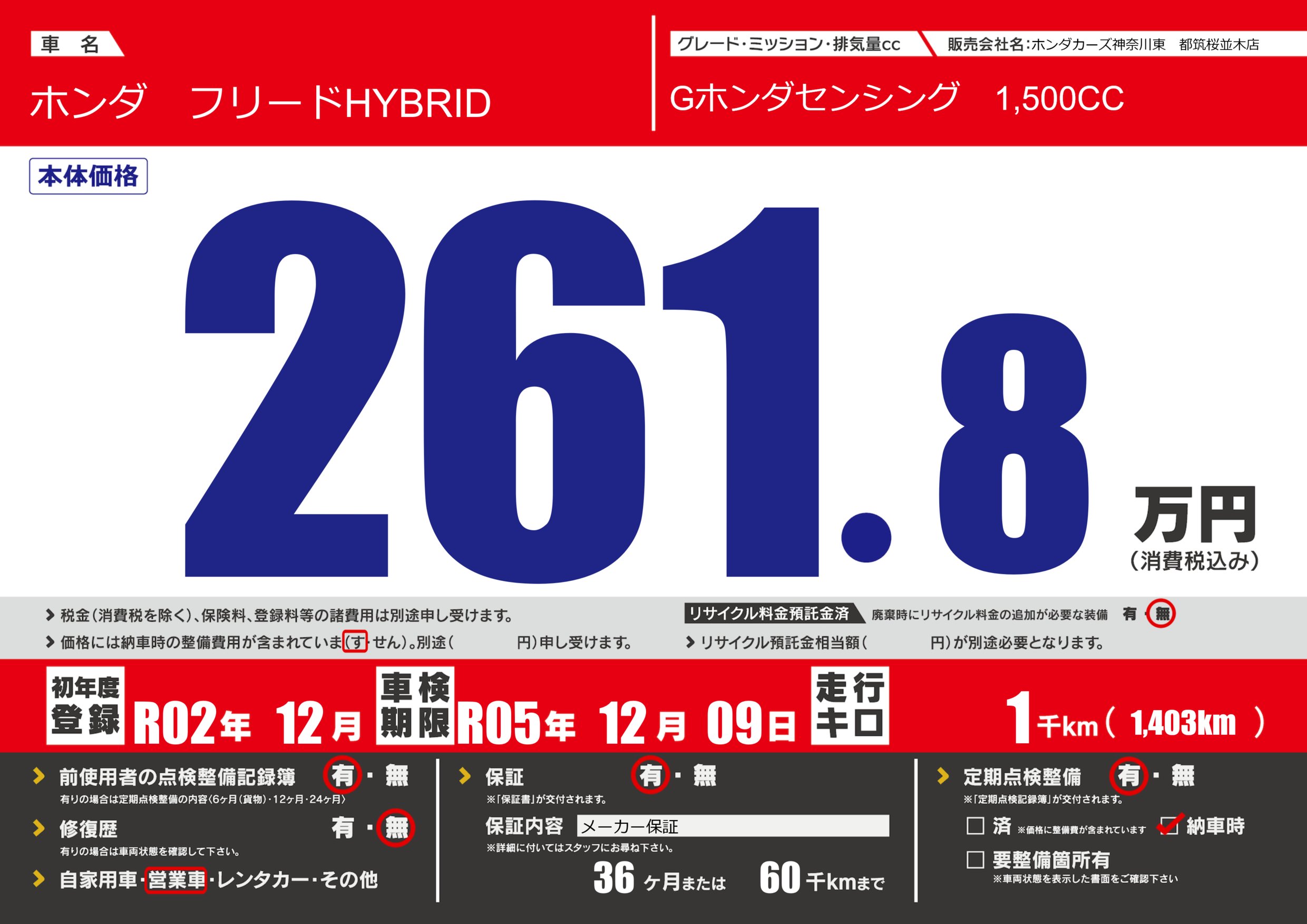 | 車名 | ホンダ フリードHYBRID | グレード ミッション 排気量 |
