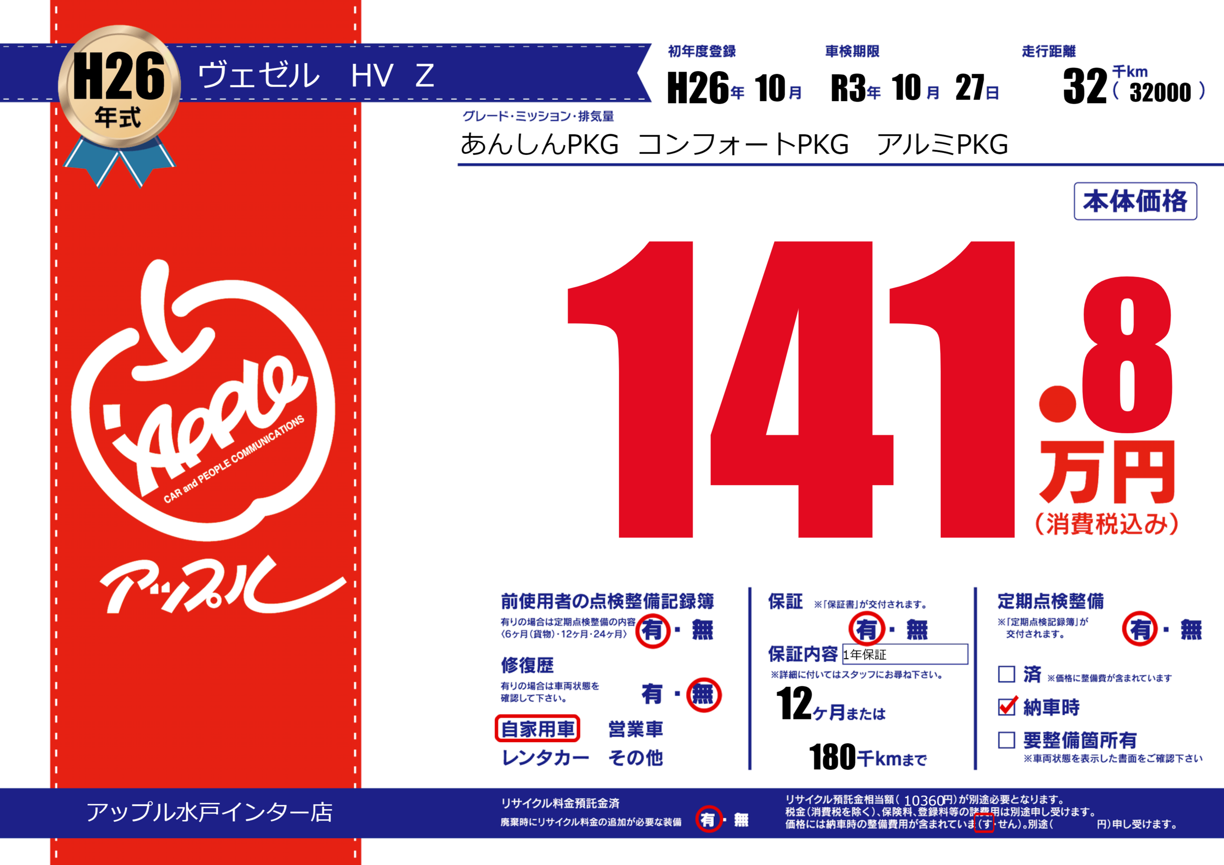 | 走行キロ | 3.2万km | 初年度登録 | H26年10月 |