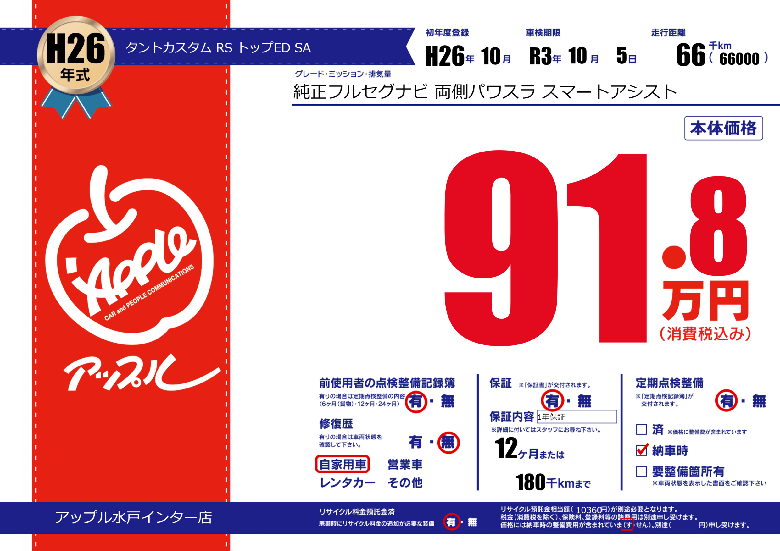 | 定期点検整備 | 定期点検整備あり 納車時あり | ||